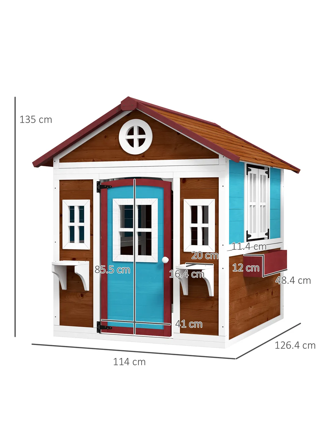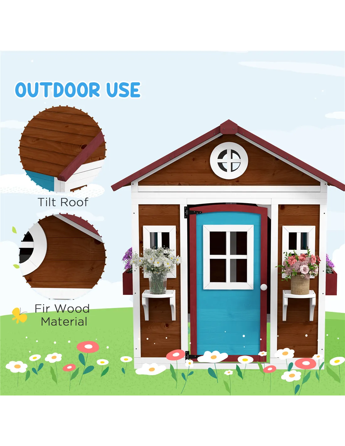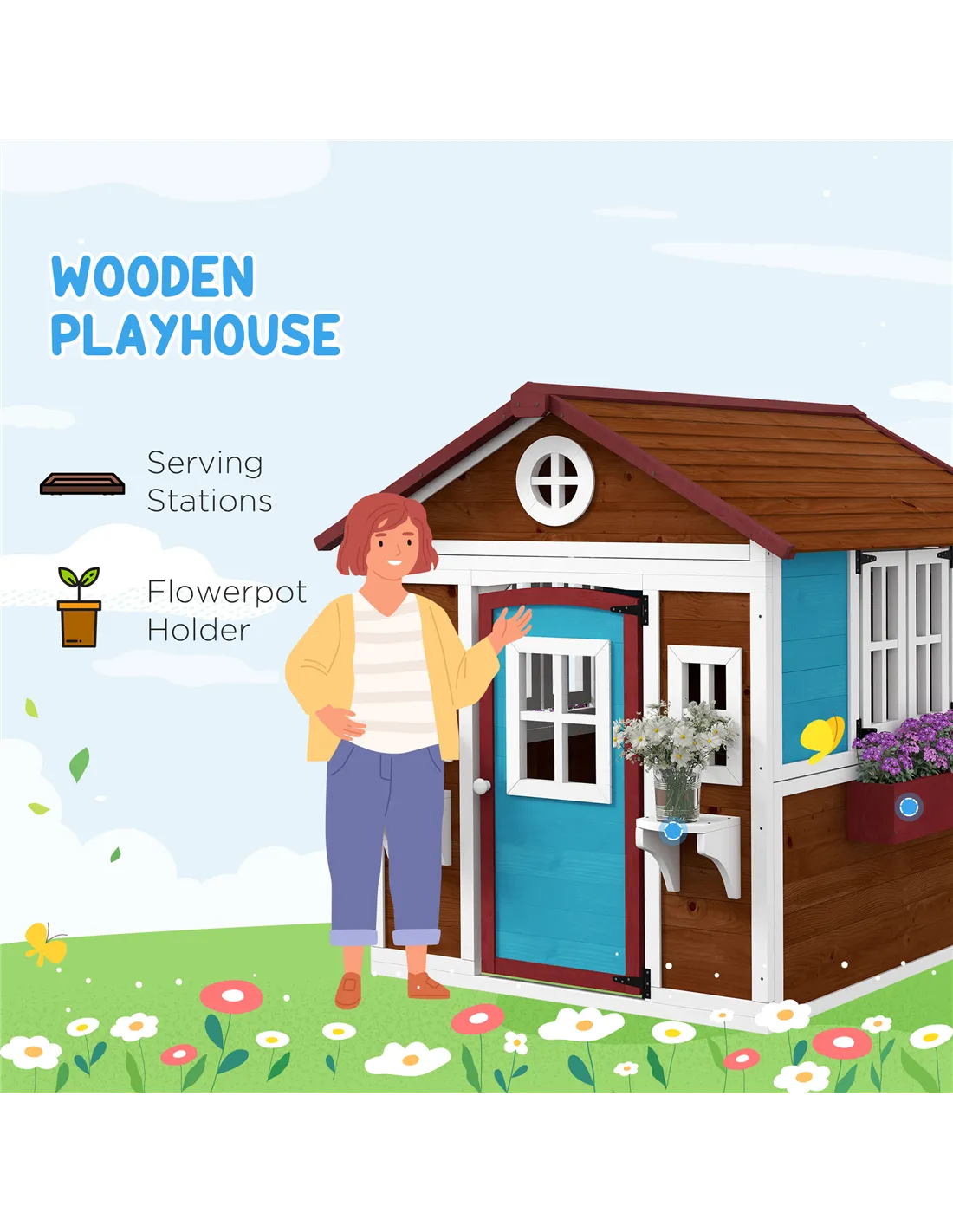 Outsunny Wooden Playhouse with Doors, Windows, Plant Pots, Boxes, for 3-8 Years - Dark Brown