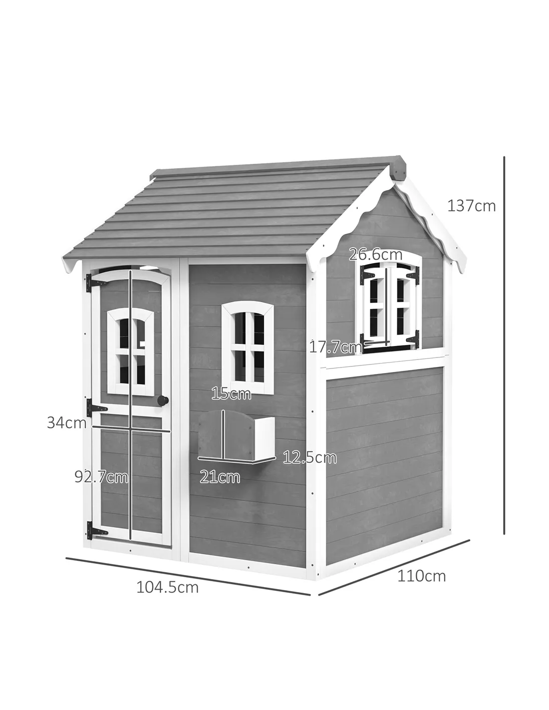 - Overall dimensions: 137H x 104.5L x 110Wcm. Eave height: 97.5cm. Door: 92.7H x 34.7Wcm. Front windows: 28.4H x 20Wcm. Side: 26.6H x 17.7Wcm. Plant box: 15H x 21L x 12.5Wcm