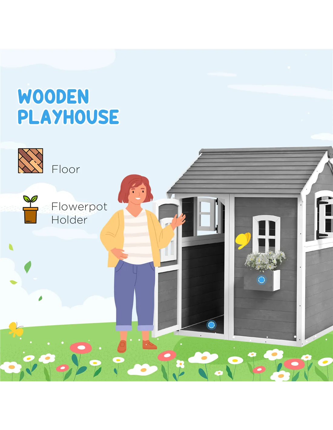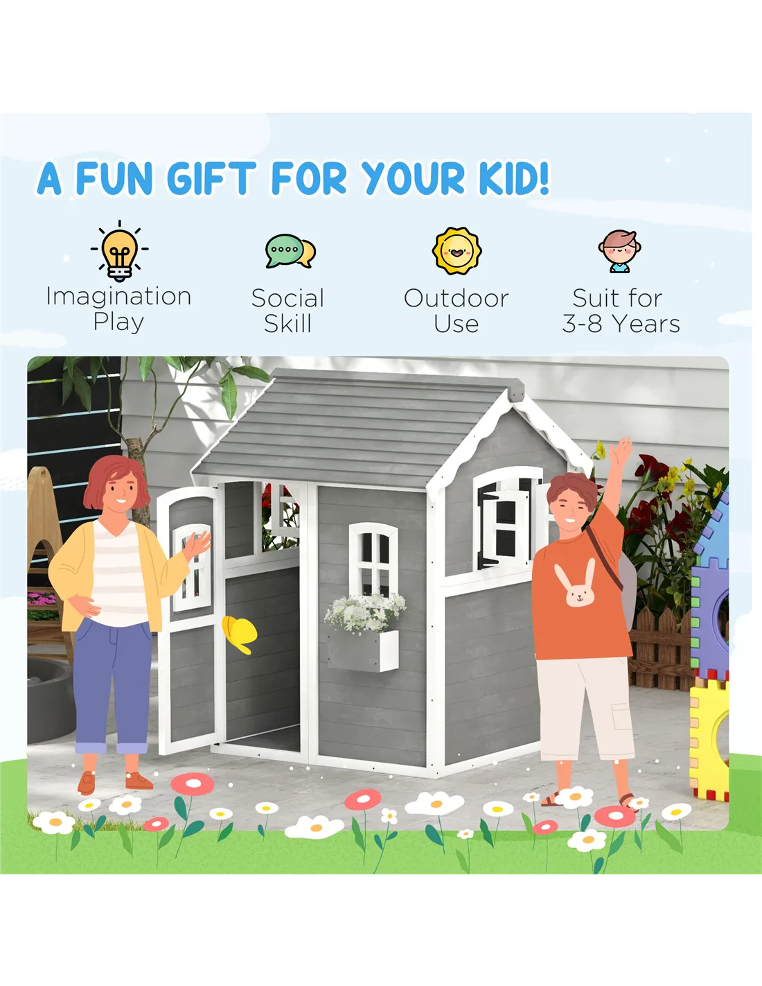Outsunny Wooden Playhouse for Kids with Doors, Windows, Plant Box, Floors, for Ages 3-8 Years, for Gardens, Lawns, Patios - Grey
