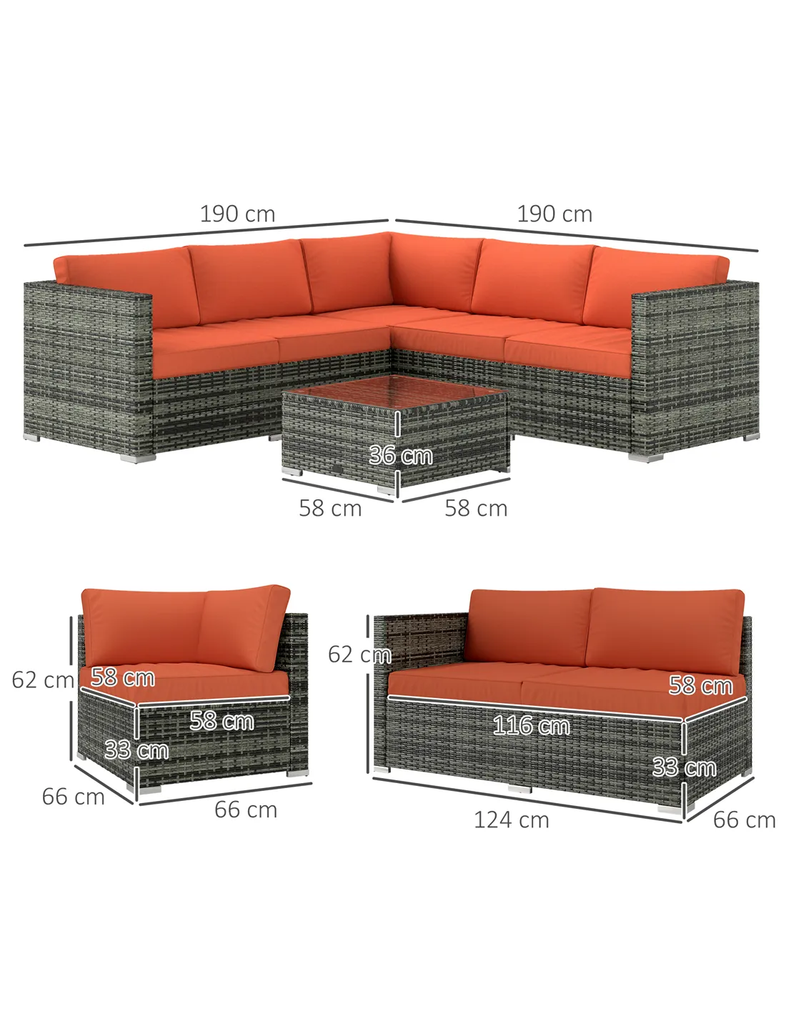 - Seat Size: 58L x 58Wcm (corner sofa), 116L x 58Wcm (loveseat)