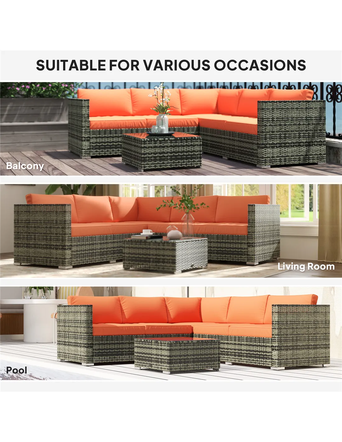 The Outsunny four-piece rattan sofa set in vibrant orange and grey is perfect for enhancing your outdoor living space. Ideal for garden patios, balconies, or conservatories, this set creates a welcoming area for socialising or unwinding. Arrange the two loveseats and corner chair around the tempered glass coffee table to enjoy morning coffees, alfresco dining, or evening drinks with friends and family. Thanks to its weather-resistant steel frame and durable PE rattan weave, it withstands the British climate while maintaining style and comfort. The washable cushions add practicality, making it suitable for both casual relaxation and entertaining guests.