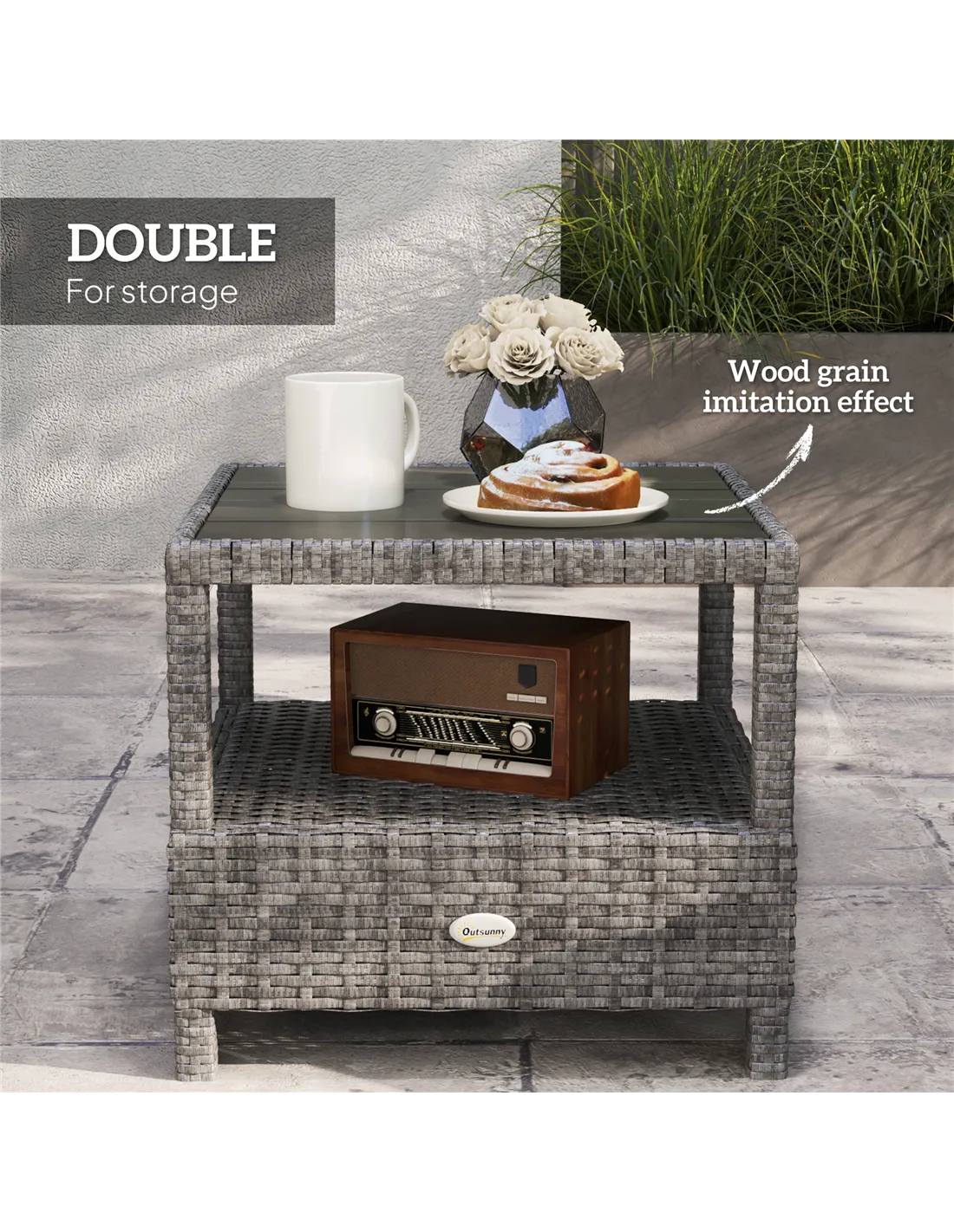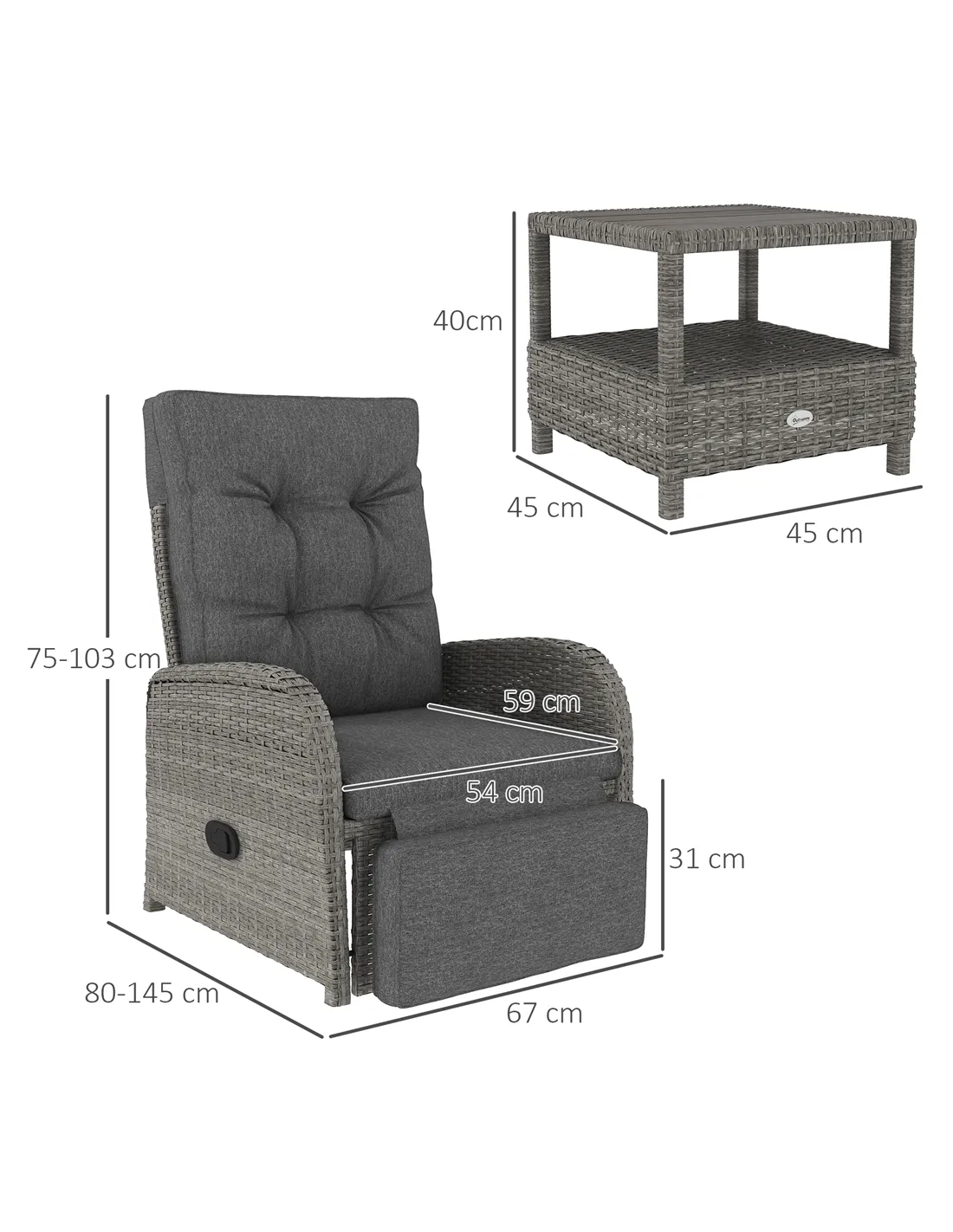 Unrivalled comfort for the garden and beyond with this Outsunny garden furniture set. Powder coated aluminium frames mean a strong core, wrapped in stylish plastic rattan - a protective shell. The two chairs feature a reclining back, maximum 150° angle, with footrest to elevate your lower body. The rattan bistro set is complete with a two-tier table for a handy holding spot.