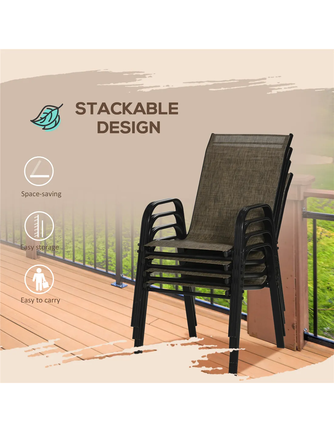 The Outsunny set of four stackable mesh seat chairs in mixed brown is perfect for enhancing your outdoor living space. Ideal for garden dining, these chairs provide comfortable seating for family gatherings or casual alfresco meals. Their breathable mesh fabric ensures cool comfort during warm British summers, while the sturdy metal frame offers reliable support. Thanks to their stackable design, these chairs are easy to store when not in use, making them suitable for patios, balconies, or conservatories. Whether hosting a barbecue or enjoying a quiet morning coffee, this set brings practical style and convenience to your outdoor area.