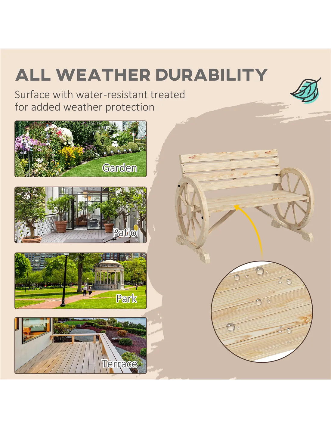 With wagon wheel armrests, this Outsunny garden bench will create a unique conversation start for any outdoor space. It's made from fir wood - a hardwood which will support you and is suitable for outdoor use. The slatted design of the seat prevents heavy water build up, whilst the high back supports your body. A bench like bench is a point of interest in your garden and beyond.