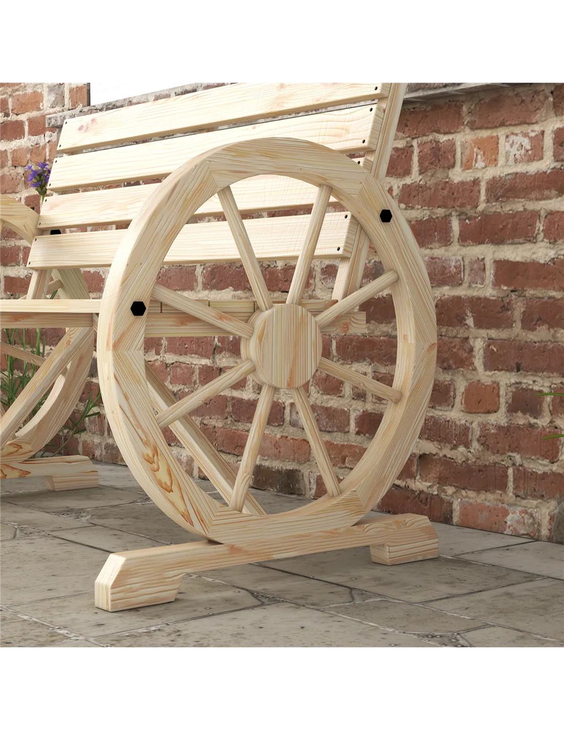 - Wagon wheel armrests for a unique silhouette, sure to make the bench a conversation piece