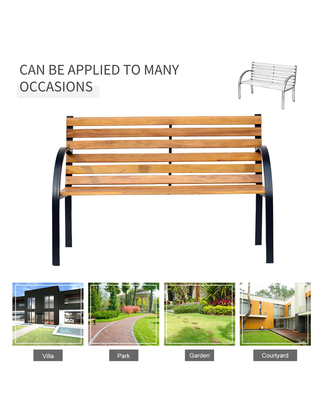 The Outsunny garden bench, measuring 122L x 60W x 80H cm, is a versatile addition to any outdoor space. Perfectly suited for a quiet corner in your garden, it also complements patios, decks, and park areas. Its robust steel frame and natural wood finish create a charming focal point for relaxing with a book or sharing a conversation with a friend. Place it beneath a shady tree or alongside flower beds to enhance your outdoor living experience. Thanks to its ergonomic backrest and generous seating, it comfortably accommodates two people, making it ideal for family gatherings or peaceful moments in your front or backyard.