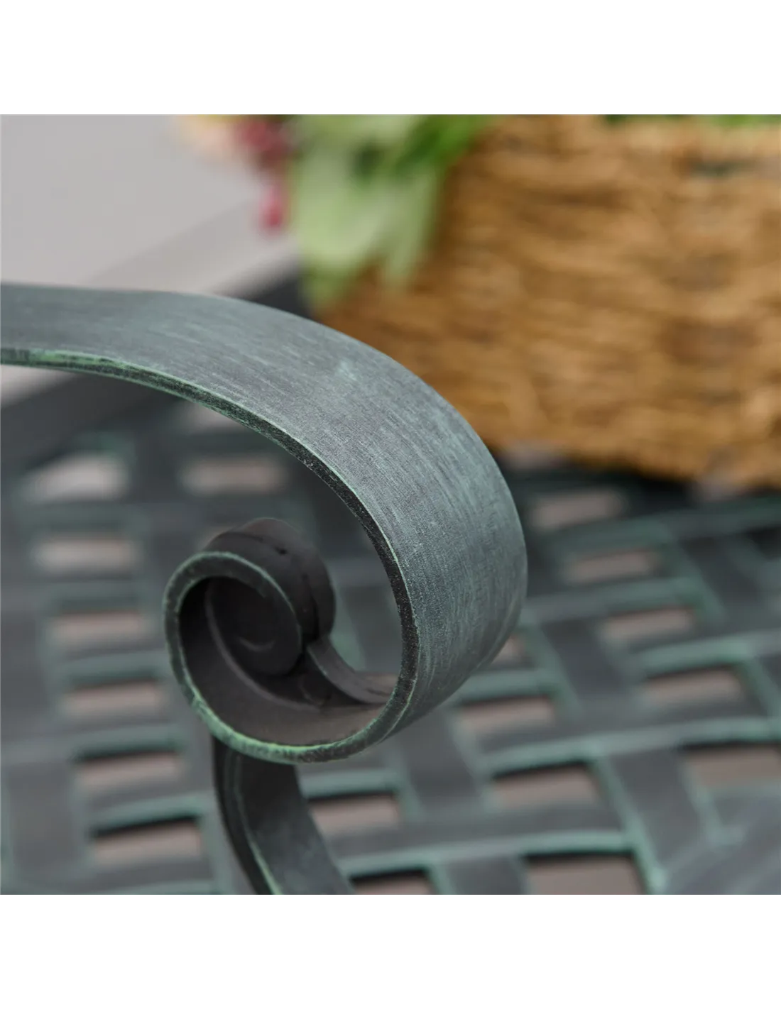 - Enhances garden spaces with its antique verdigris finish, adding a touch of vintage charm to parks or private backyards.