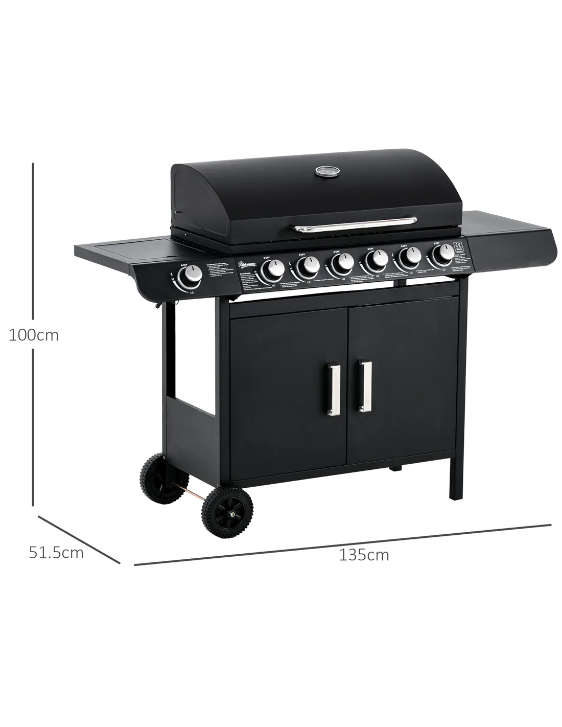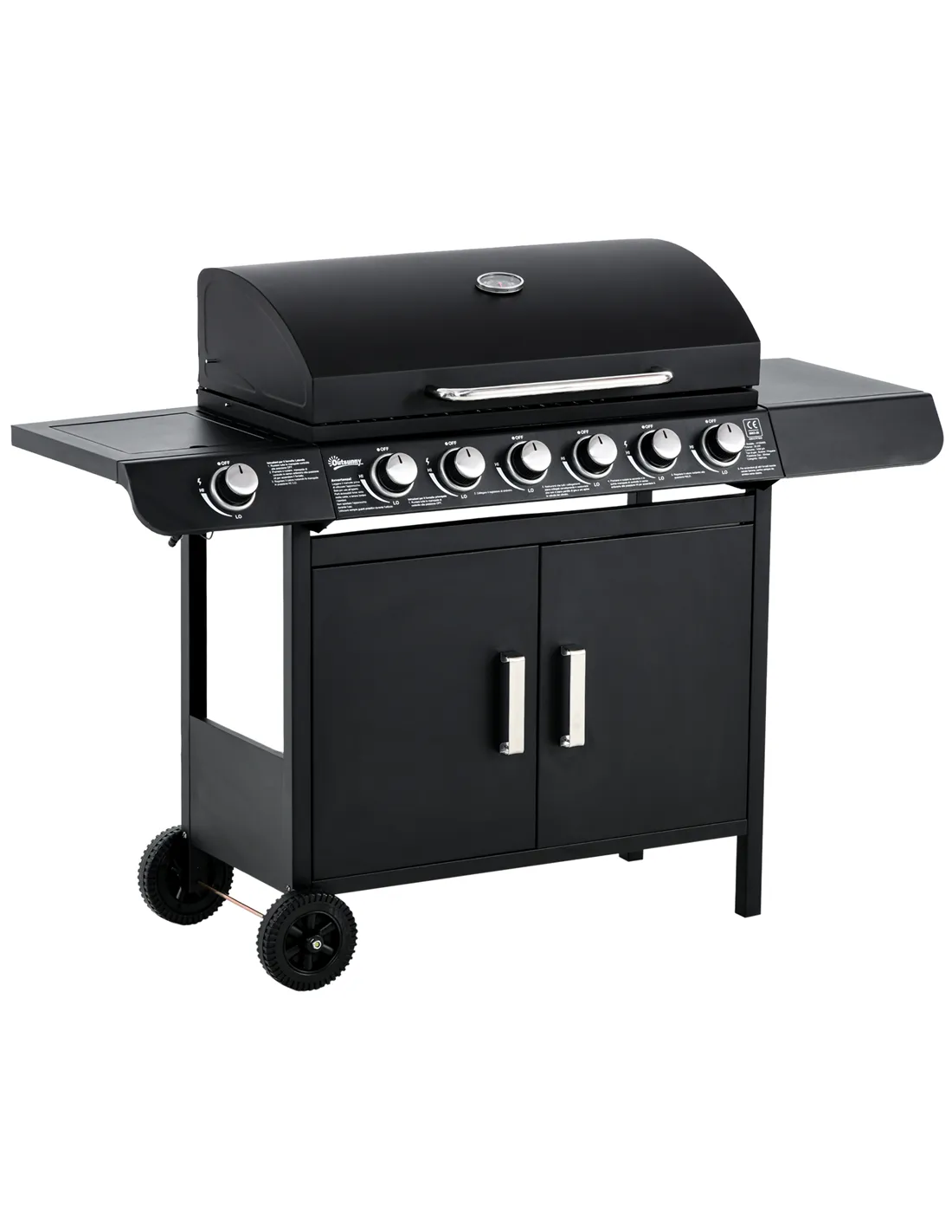 Get friends together and enjoy delicious BBQ food with this Outsunny gas grill. It features six main burners, with and a side cooking plate with individual gas burner; controlled by piezo ignition for easy, separate operation. The large 2646cm² grilling area means plenty of cooking space. An easy-to-read thermometer is connected to the lid. Two shelves on both sides and cupboard provide storage, complete with two wheels to move easily.
