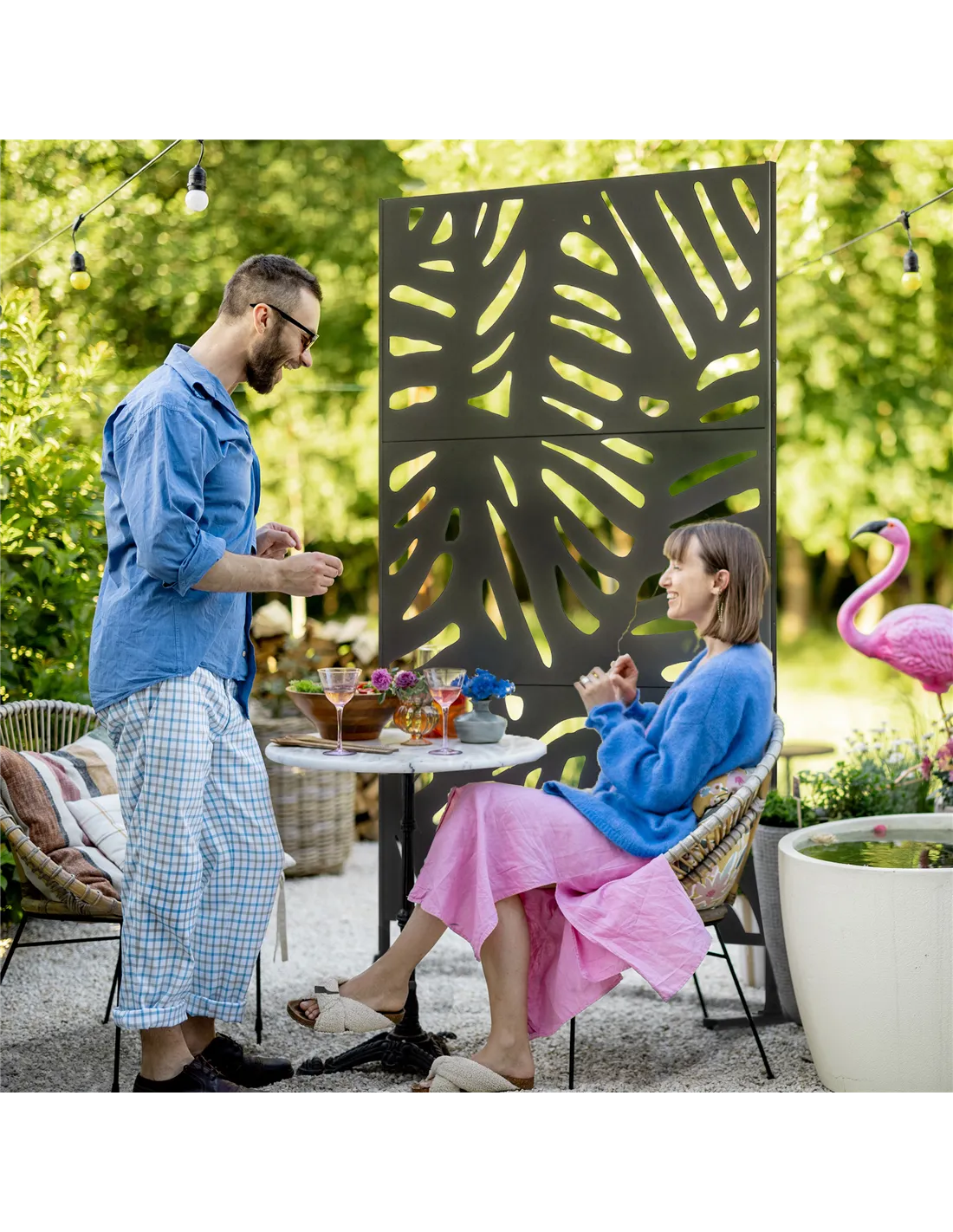 The screen is designed for decorative use and space separation; it is see-through to some extent, providing partial privacy while enhancing garden aesthetics.
