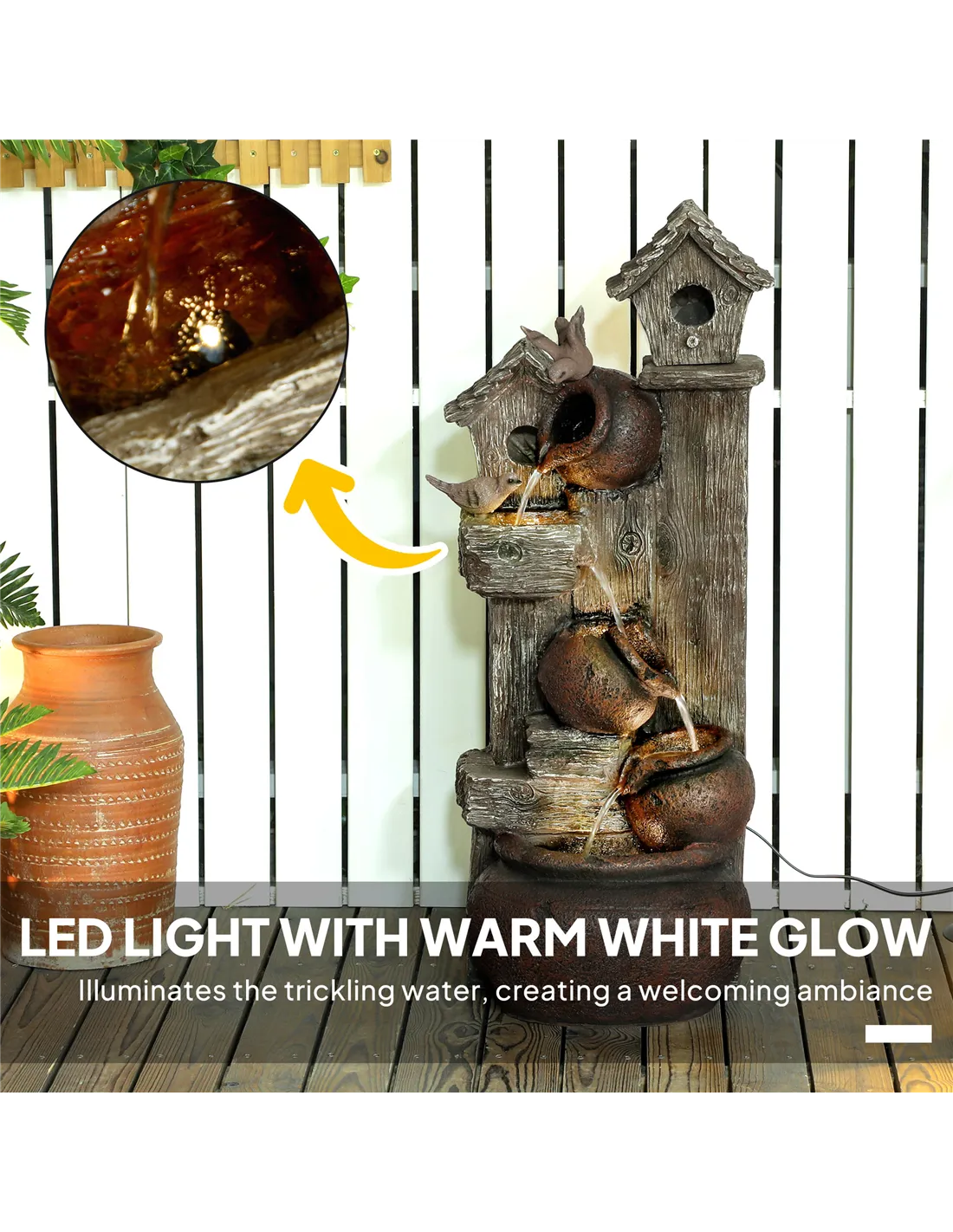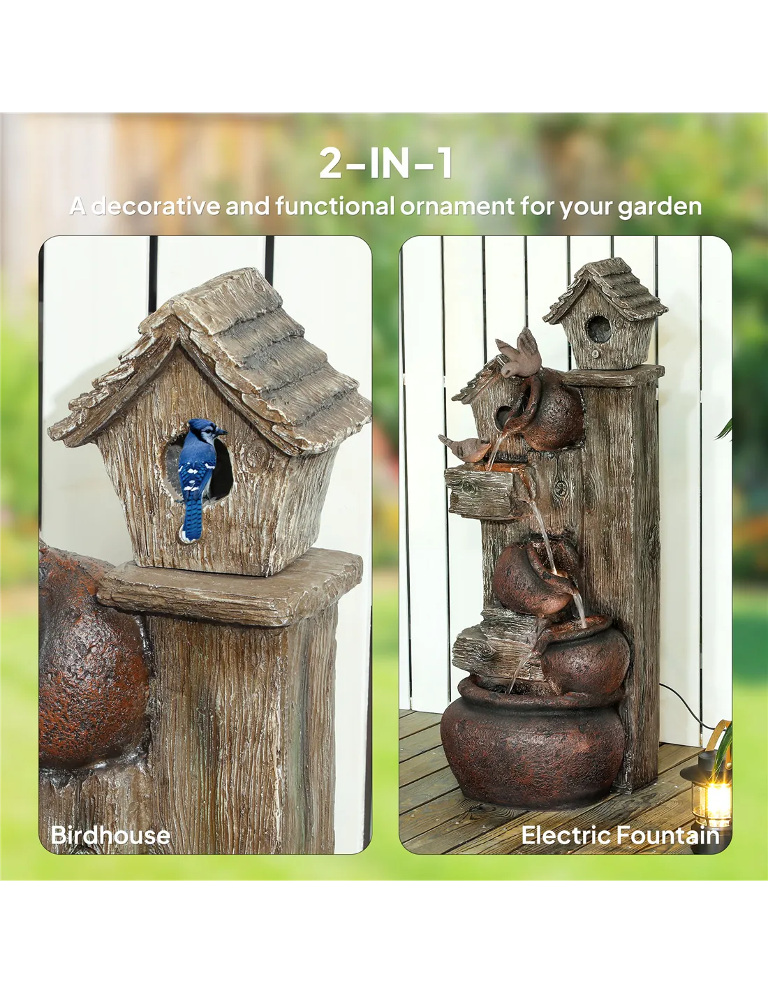 Outsunny 2-in-1 Waterfall Fountain with Birdhouse, Resin Garden Water Fountain with LED Lights Pump, Cascading Garden Water Feature with Tree Trunk Design, Multi-colour