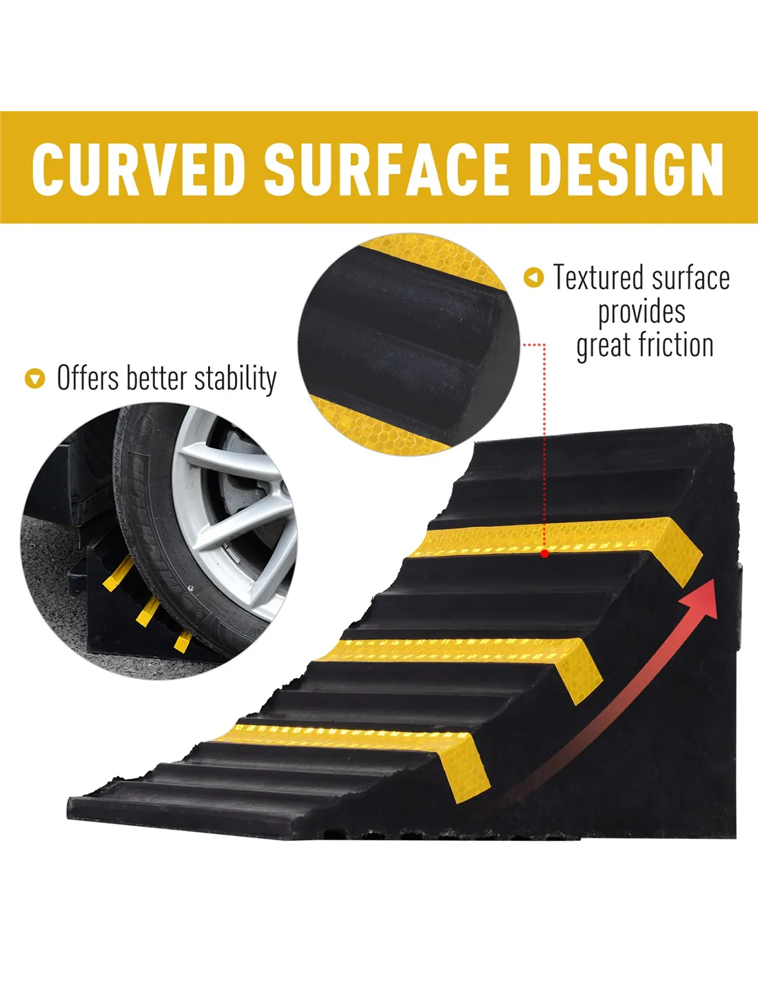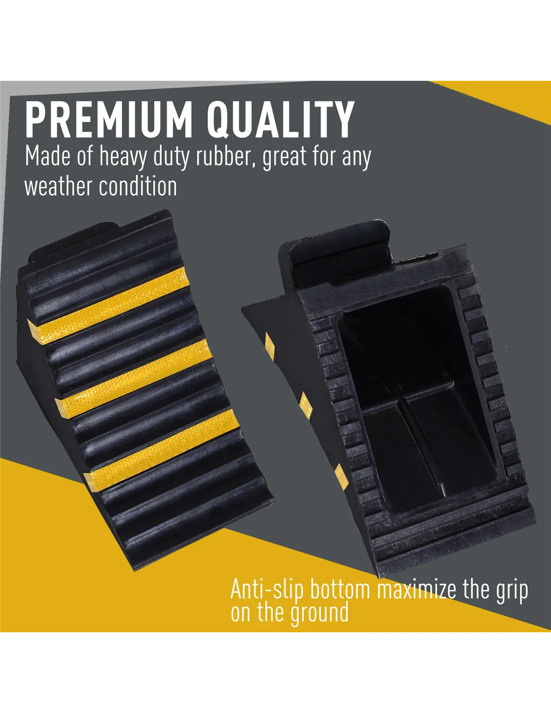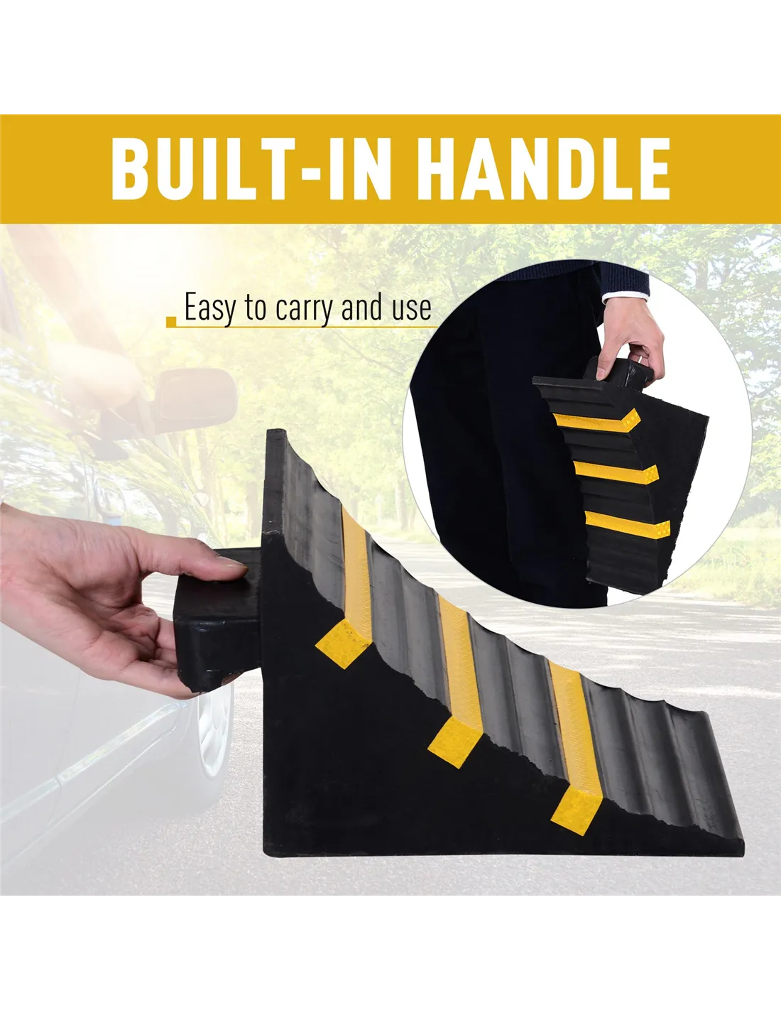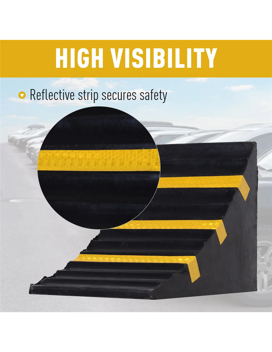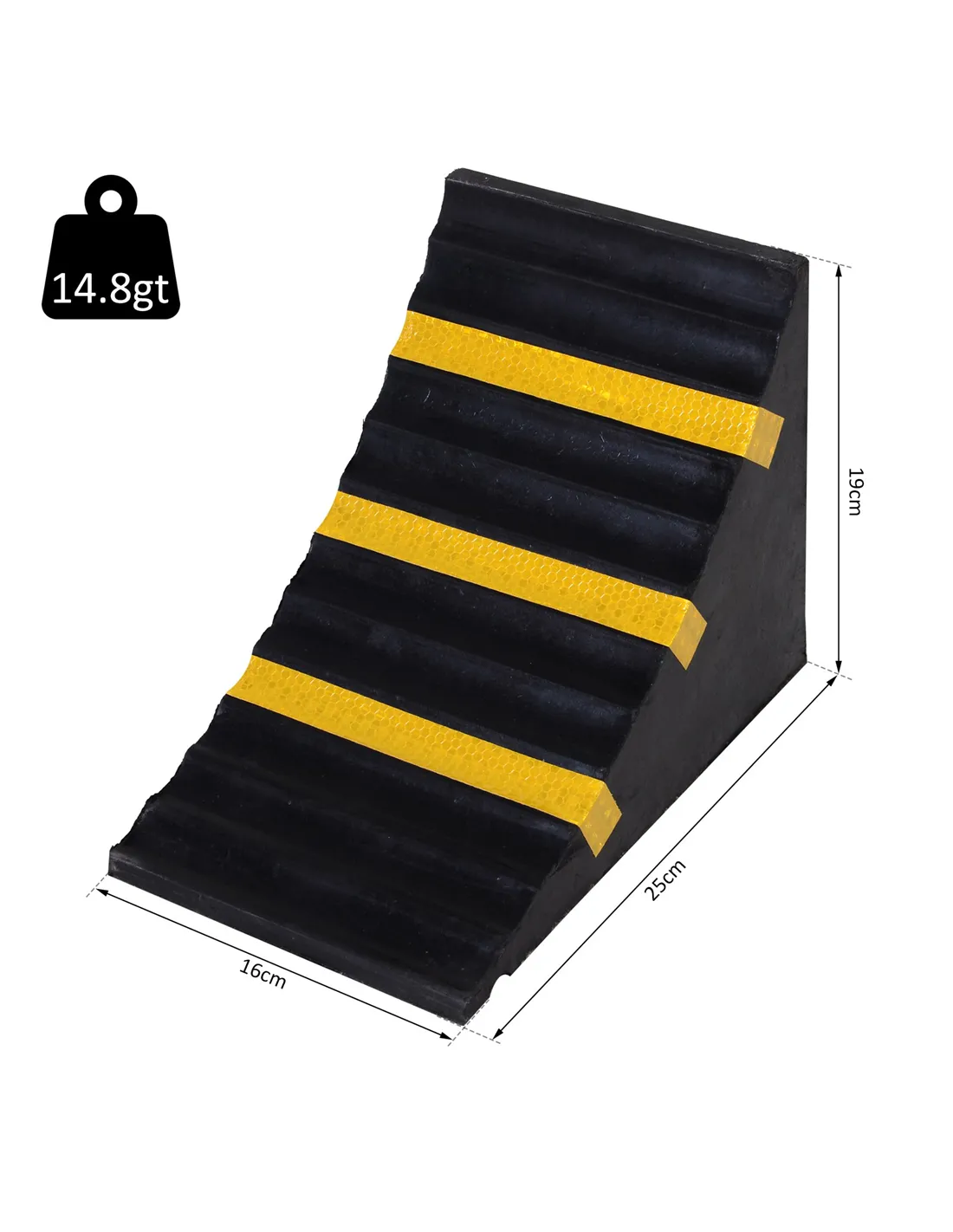 Prevent your car from moving forwards with this set of two wheels chocks from HOMCOM. Made from thick and durable rubber, its clever right angle design helps it slot into an angle with ease, whilst the top surface with grooves allows wheels to grip on for prolonged time periods, which helps the wheels of the vehicle keep stationery for ultimate safety. Covered with three reflective strips to make it visible, even in darker rooms, each chock is finished with a built-in handle to carry. A hard wearing product to help make your car maintenance much easier.
