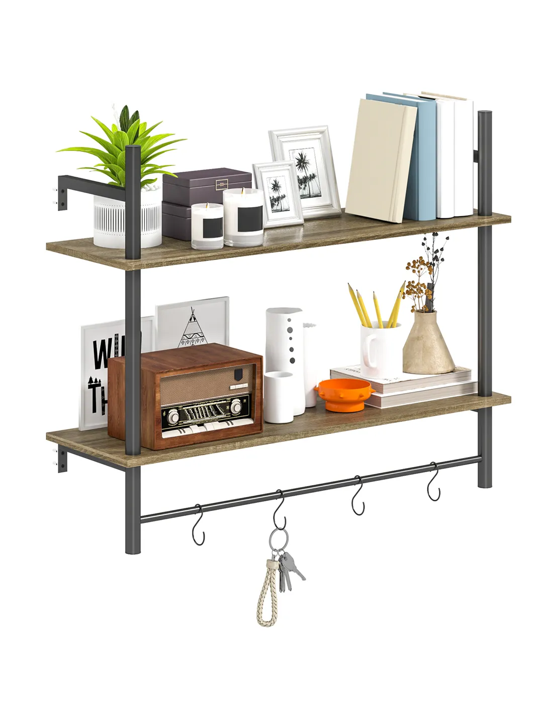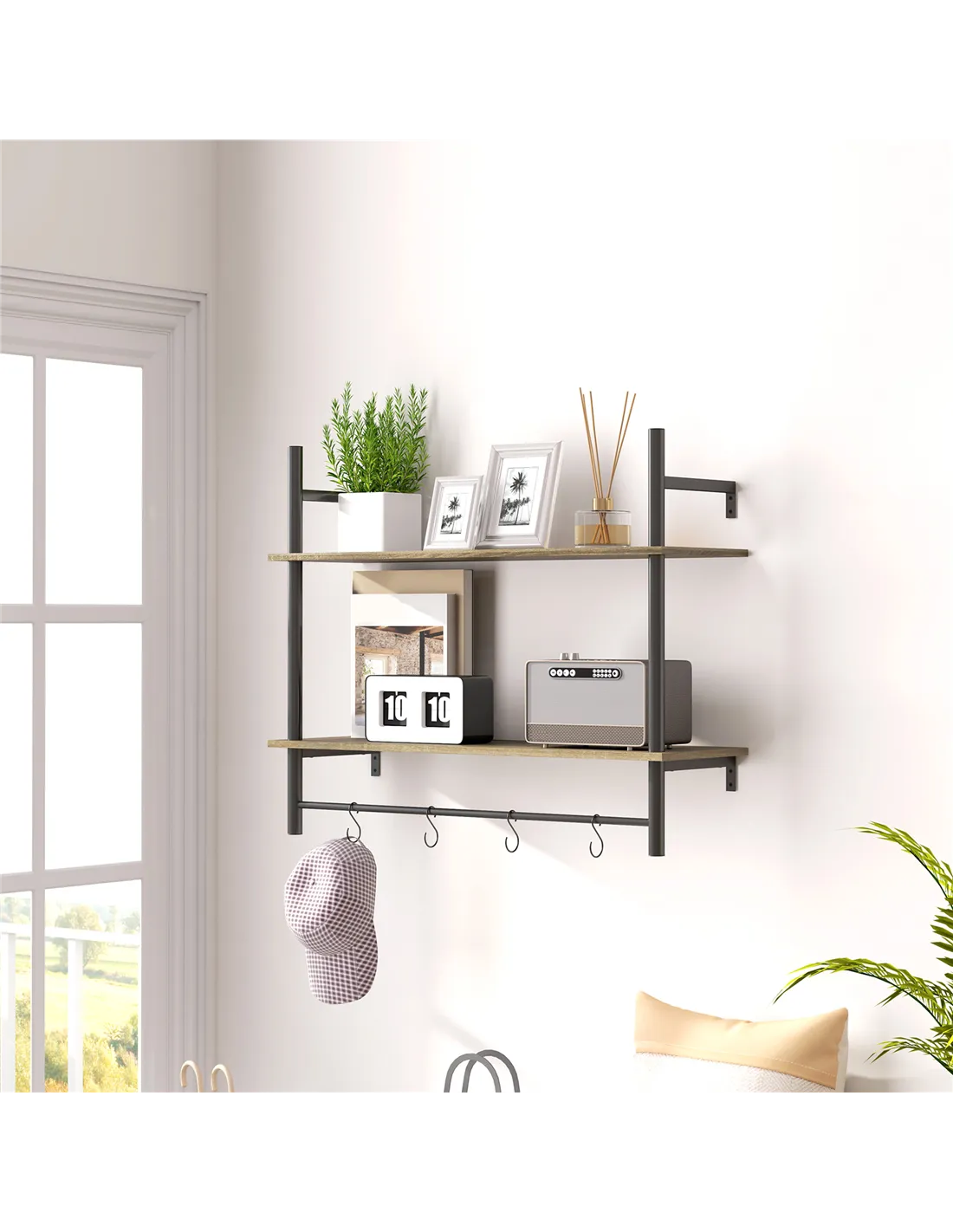 - Ideal for organising your hallway or entryway, this rustic wall shelf unit offers a stylish spot to hang coats, scarves, and keys using the four sturdy hooks.
