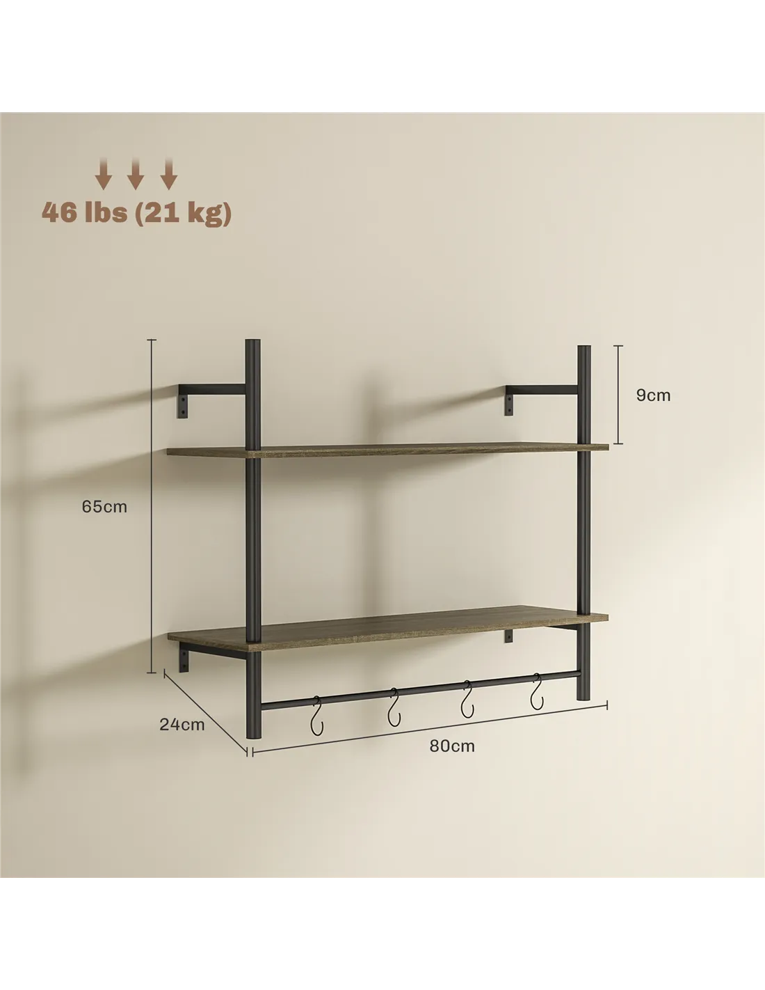 The total weight capacity is 21kg, with the upper shelf supporting up to 8kg, the shelf rod 3kg, and each hook up to 0.5kg. - Can this shelf be installed on any wall type?