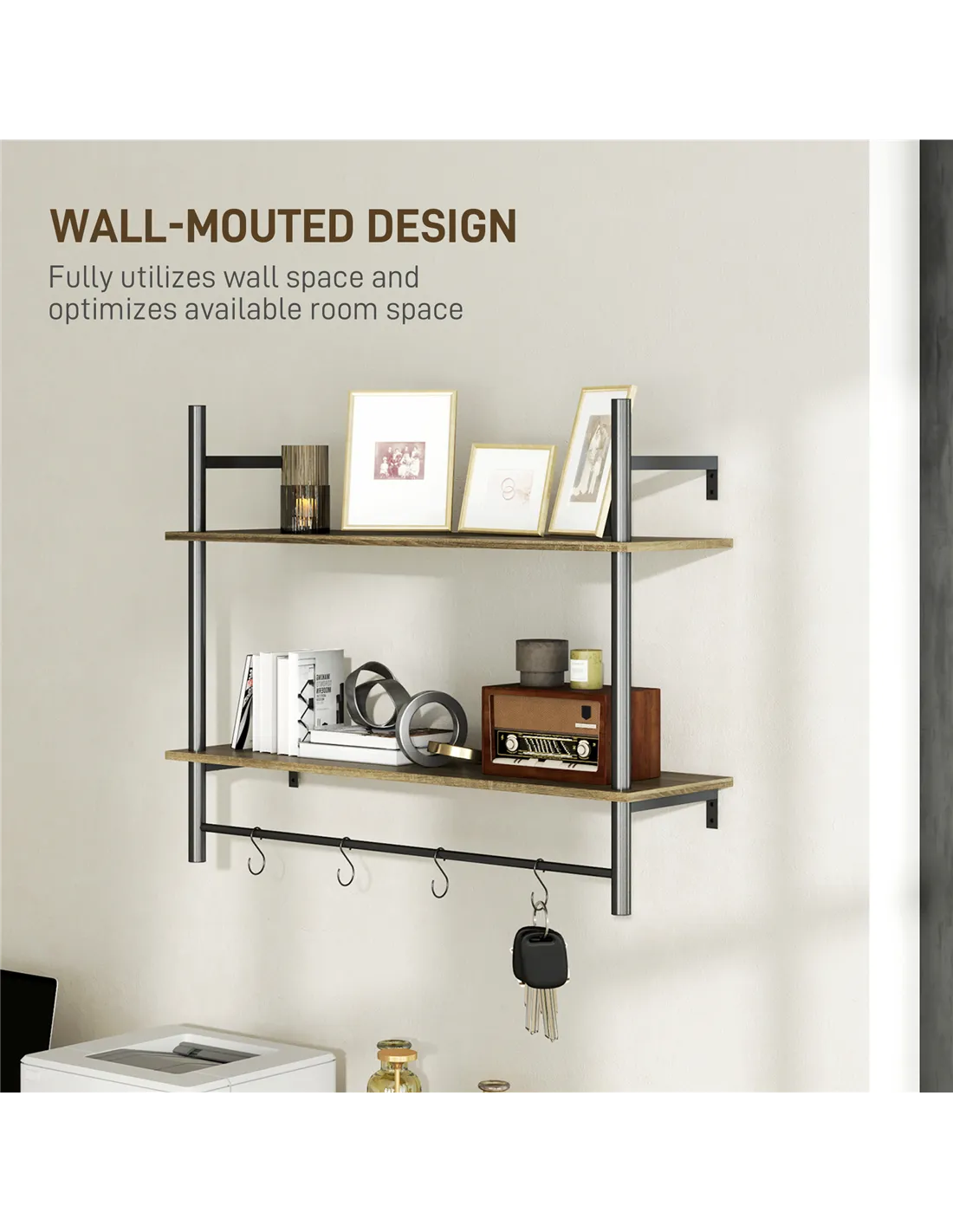 Transform your walls into a stylish and practical display with HOMCOM hanging shelf. The two-tier wall shelves, paired with four snazzy S-shaped hooks, cater to all your storage needs. The chic melamine finish ensures easy cleaning, while the stable build with guardrails adds a layer of safety. Maximise space effortlessly with this sleek wall shelf unit!