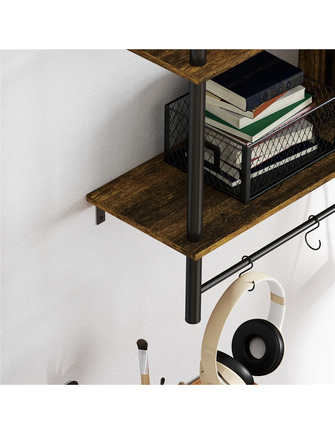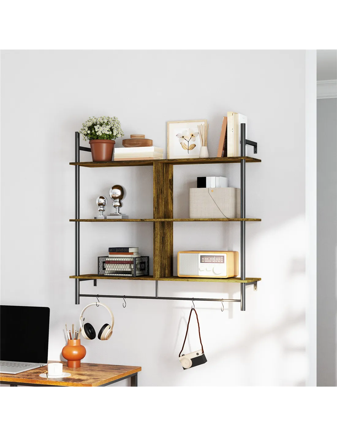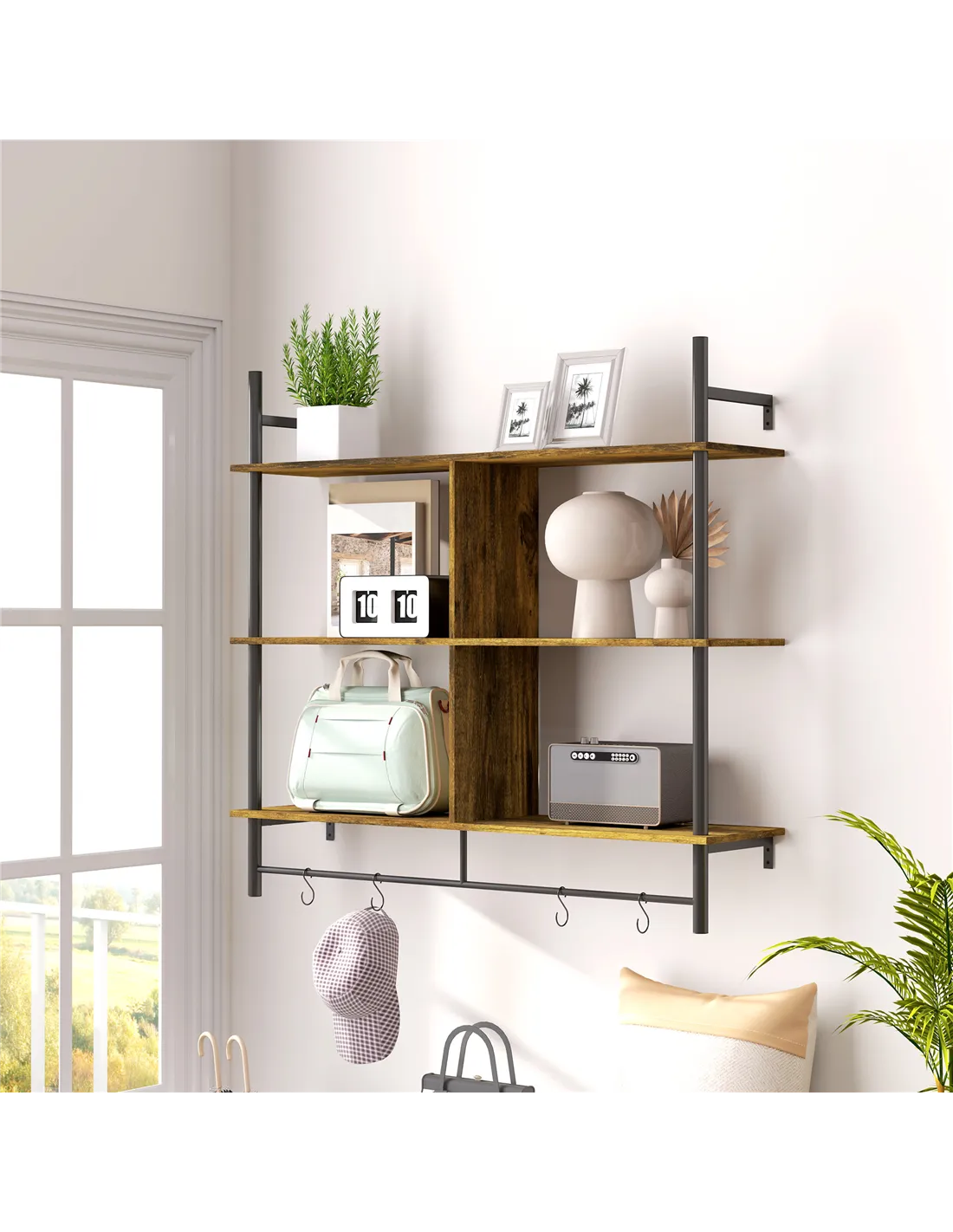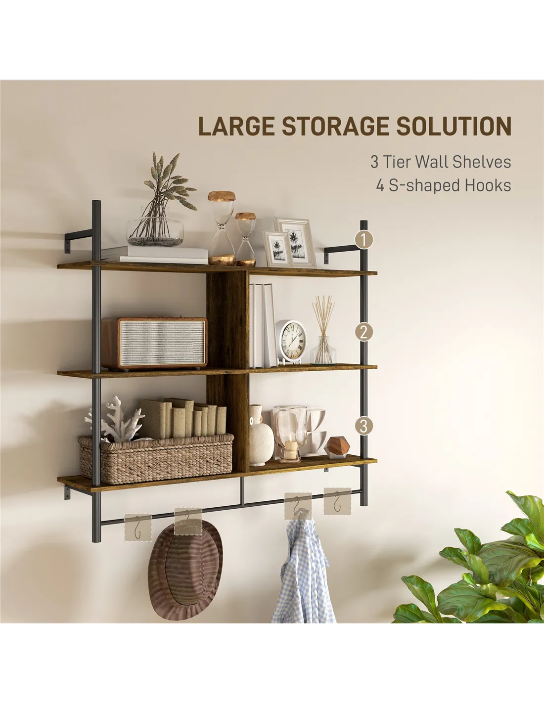 The HOMCOM three-tier floating shelf is a versatile addition to any home, ideal for maximising wall space without cluttering floors. Perfect for displaying cherished ornaments, books, or plants in your living room or hallway, it also serves as a practical storage solution in kitchens for spices and utensils, or in bathrooms for toiletries and towels. The included 'S' hooks provide extra hanging options for keys, mugs, or lightweight accessories, making it a functional yet stylish feature in any room. Its rustic brown finish with black accents complements a variety of interior styles, from modern industrial to cosy rustic.