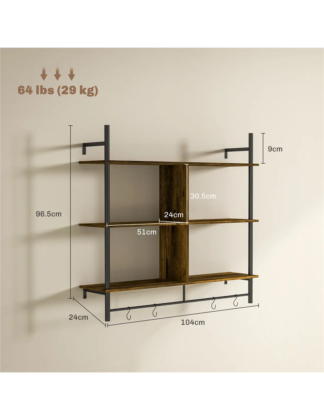 - Weight Capacity: 29kg (total), 8kg (top), 4kg (shelf), 3kg (shelf rod), 0.5kg (hook)