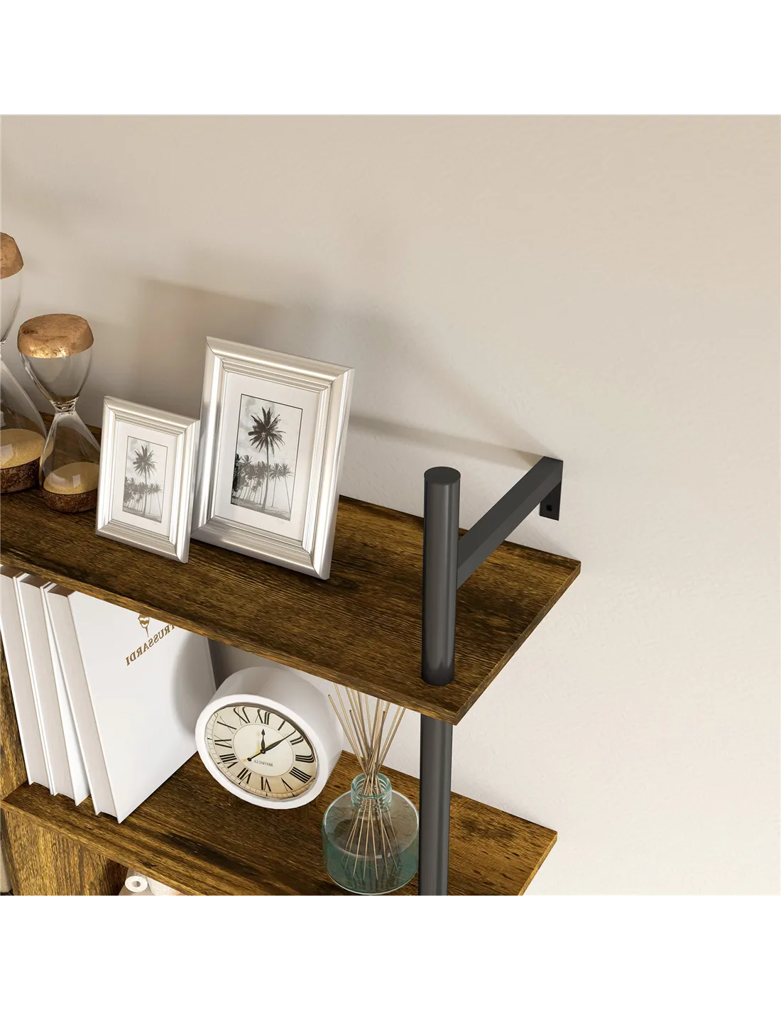 Save space by displaying your favourite pieces with this HOMCOM floating shelf. The three-tier design means it offers plenty, with four 'S' shaped hooks for additional hanging space. A steel frame means a strong core, with guardrails on the top shelf for safety. Now you just need to choose where you want to set it up.