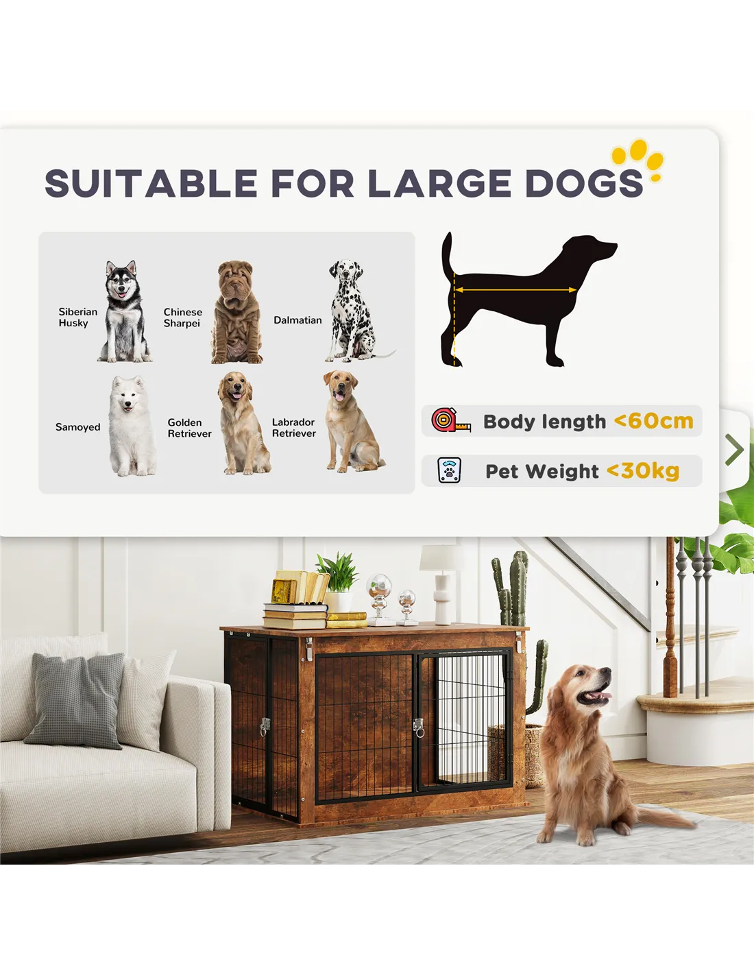 The crate is designed for large dogs up to 30kg and approximately 60cm in length. For heavier or larger breeds, alternative options may be more appropriate.