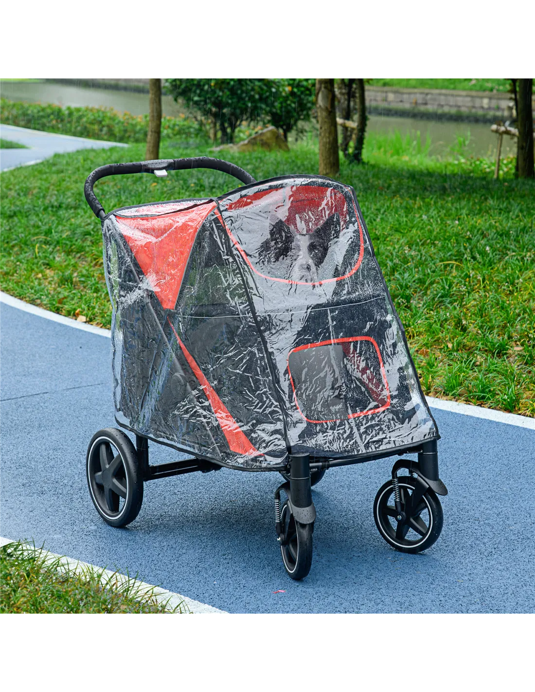 It is designed for medium to large dogs up to 30kg and less than 60cm in length, as well as cats of similar size. - Can the stroller be used in rainy weather?