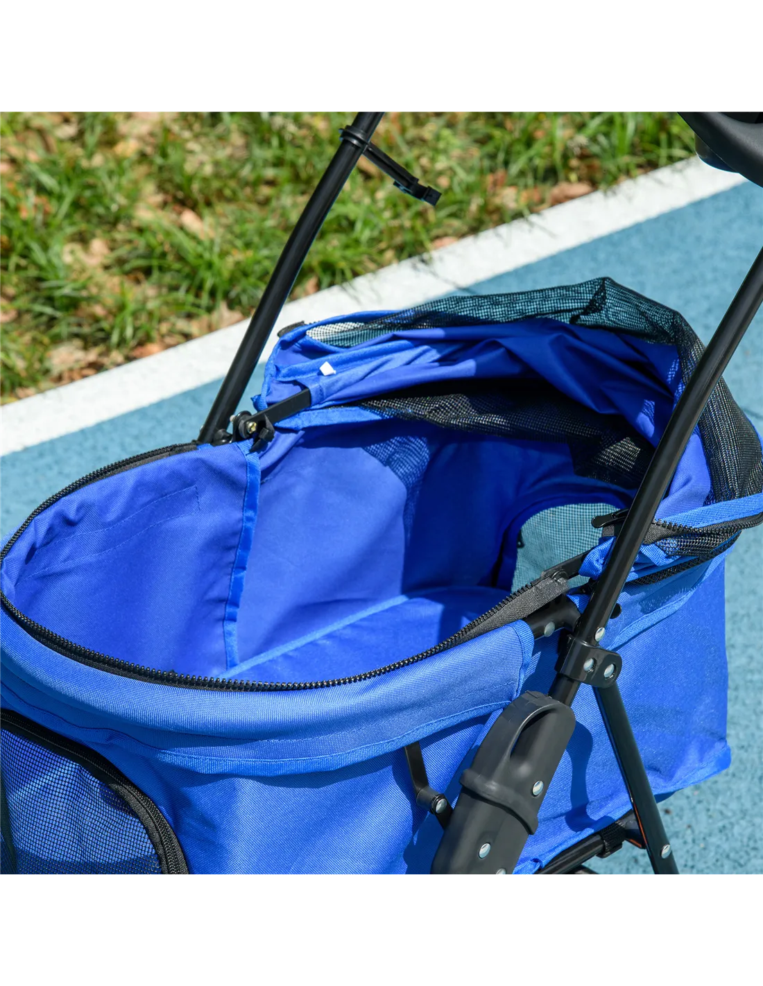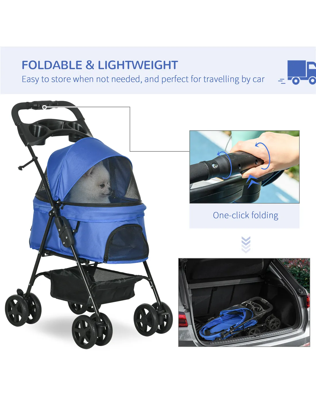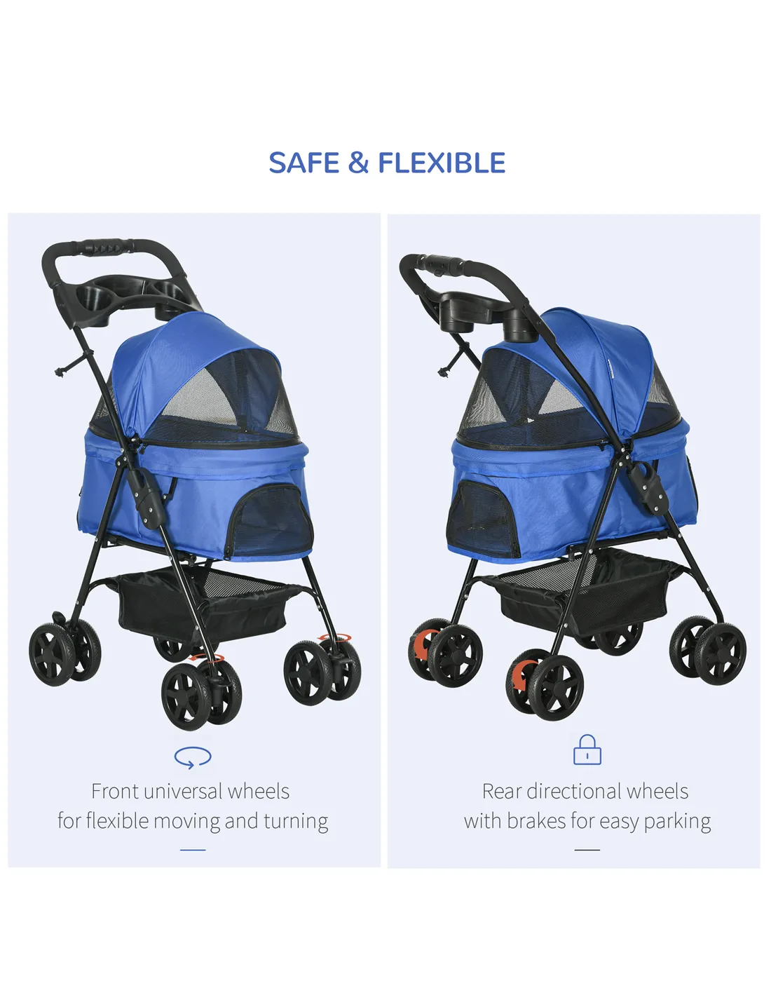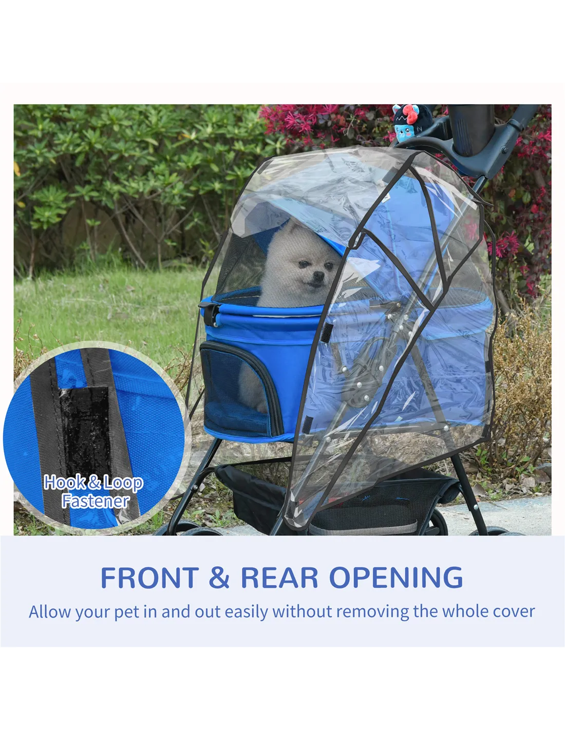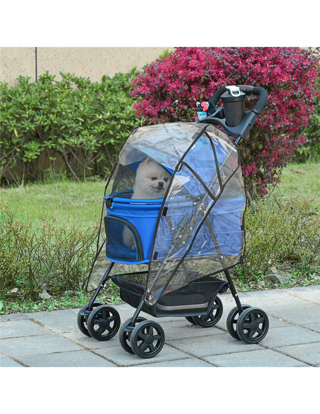 If you're looking for something easy to use, comfortable and convenient for taking injured or older pets along on the journey, look to this cat stroller from PawHut. The inner compartment is spacious and comfortable, with a mesh panel, so they can breathe. Cupholder and a basket for extra convenience, finished with four wheels to push around easily. And Lightweight rain cover can prevent cold and dampness without take off. Experience the joy of taking your pet on adventures with PawHut.