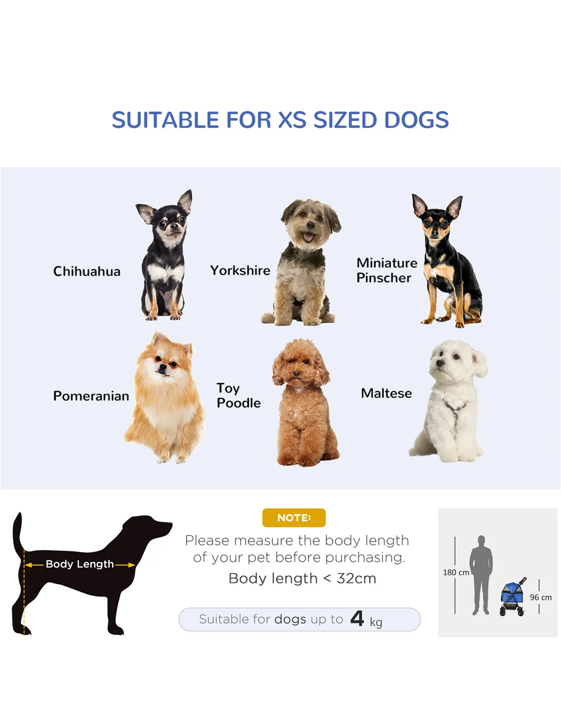 - Suitable for miniature dogs less than 32 cm in length and less than 4 kg in weight