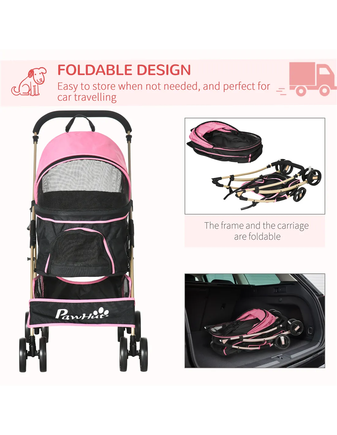 PawHut Detachable Pet Stroller with Rain Cover, 3 In 1 Cat Dog Pushchair, Foldable Carrying Bag w/ Universal Wheels, Brake, Canopy, Basket, Storage Bag for Small and Tiny Dogs - Pink