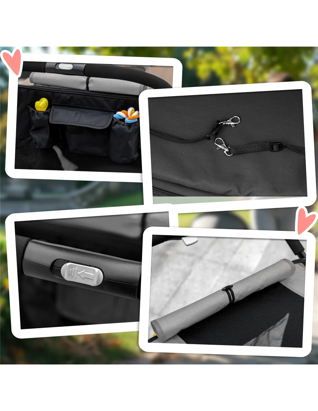 Equipped with universal EVA wheels and shock absorbers, the stroller provides a smooth ride on various surfaces, including pavements and park trails.