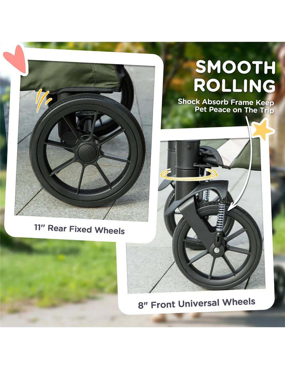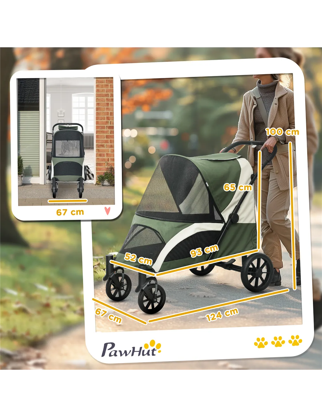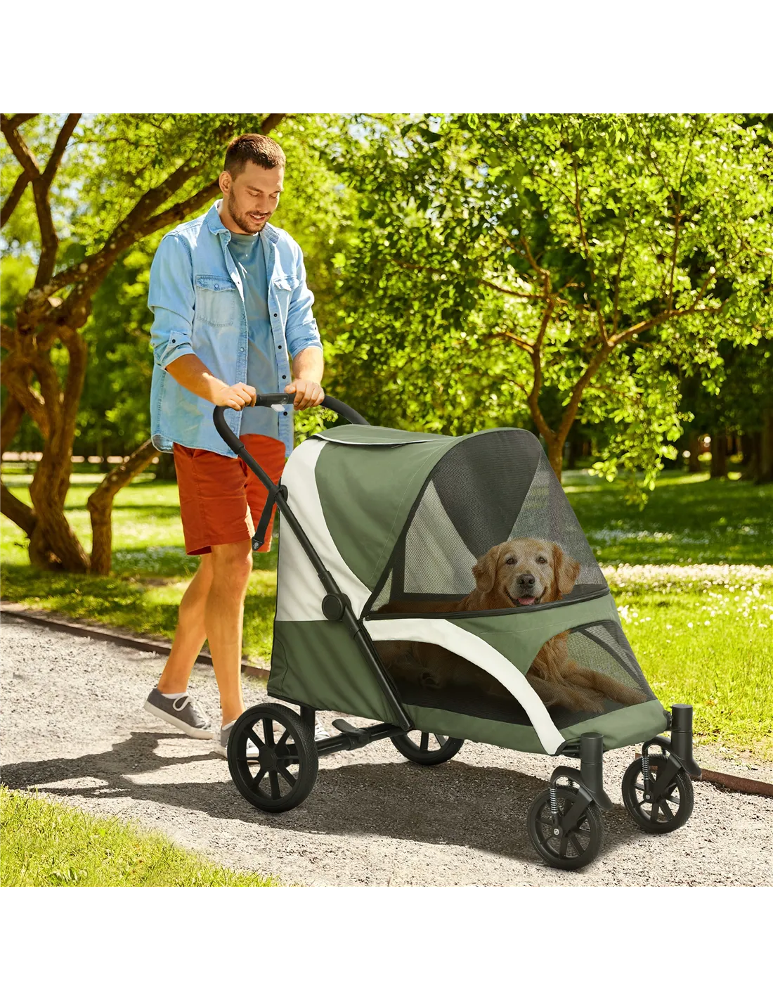 PawHut Foldable Pet Stroller for Large Dogs with Four Big Wheels, Shock-Absorbing Frame, Safety Leashes, Brakes, Dark Green