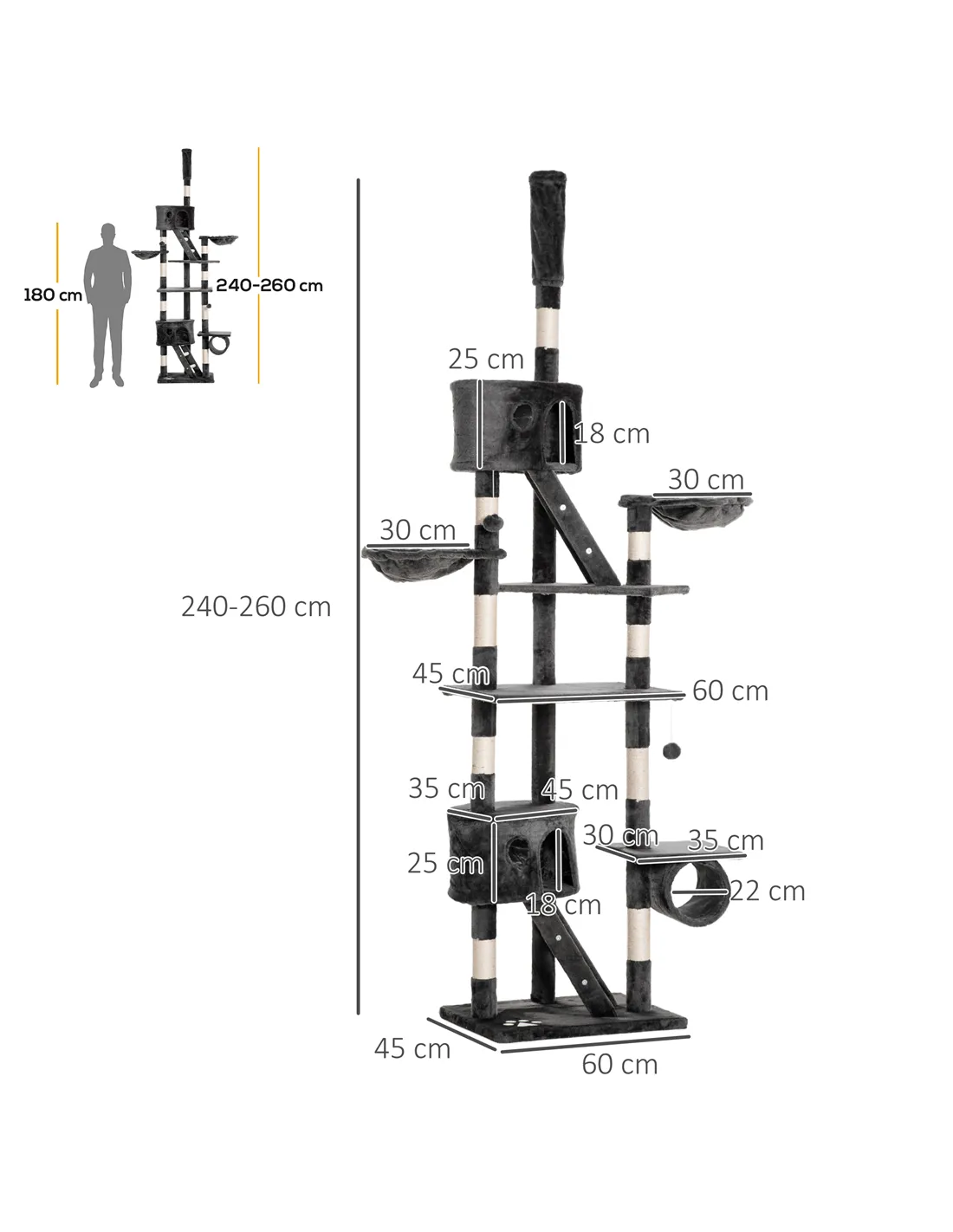 Transform your cat's world with this PawHut floor-to-ceiling cat tree. Designed for multiple cats, this tree boats multiple platforms, hammocks and cosy cat houses for endless play and rest. They'll dig their claws into the scratching post, keeping claws sharp and deterring them from damaging your sofas and carpets. Wrapped in plush upholstery, it offers unmatched comfort. Adjustable between 240-260cm, watch your pet purr with joy as they relish their new-found haven.