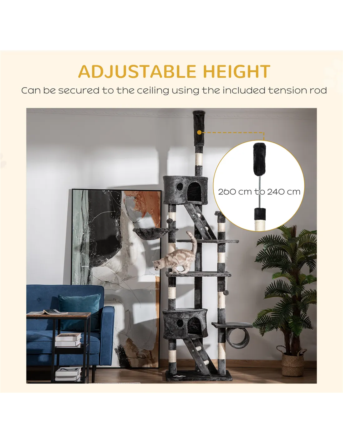 PawHut Floor-to-Ceiling Cat Tree for Indoor Cats, 240-260cm Adjustable Cat Tree - Dark Grey
