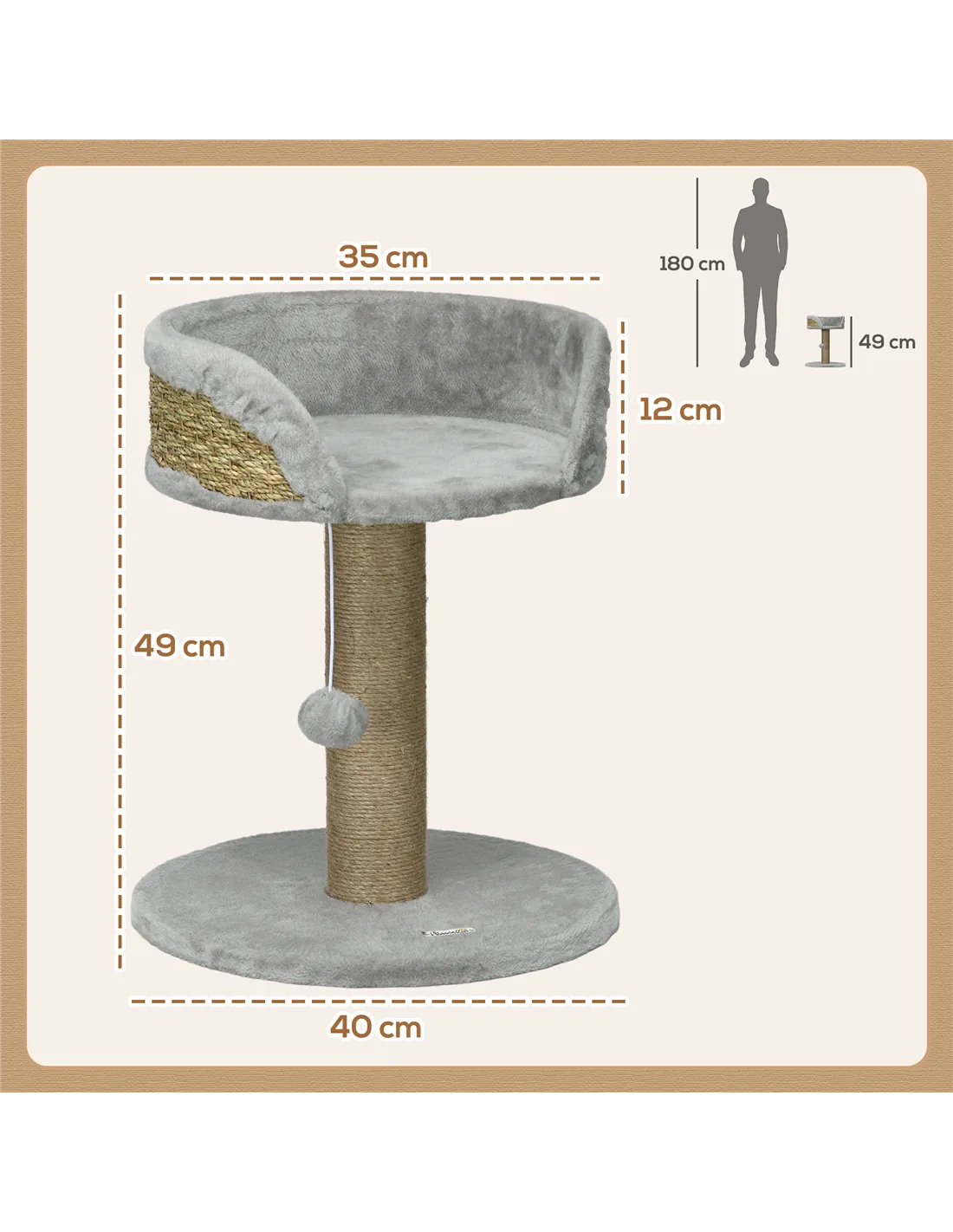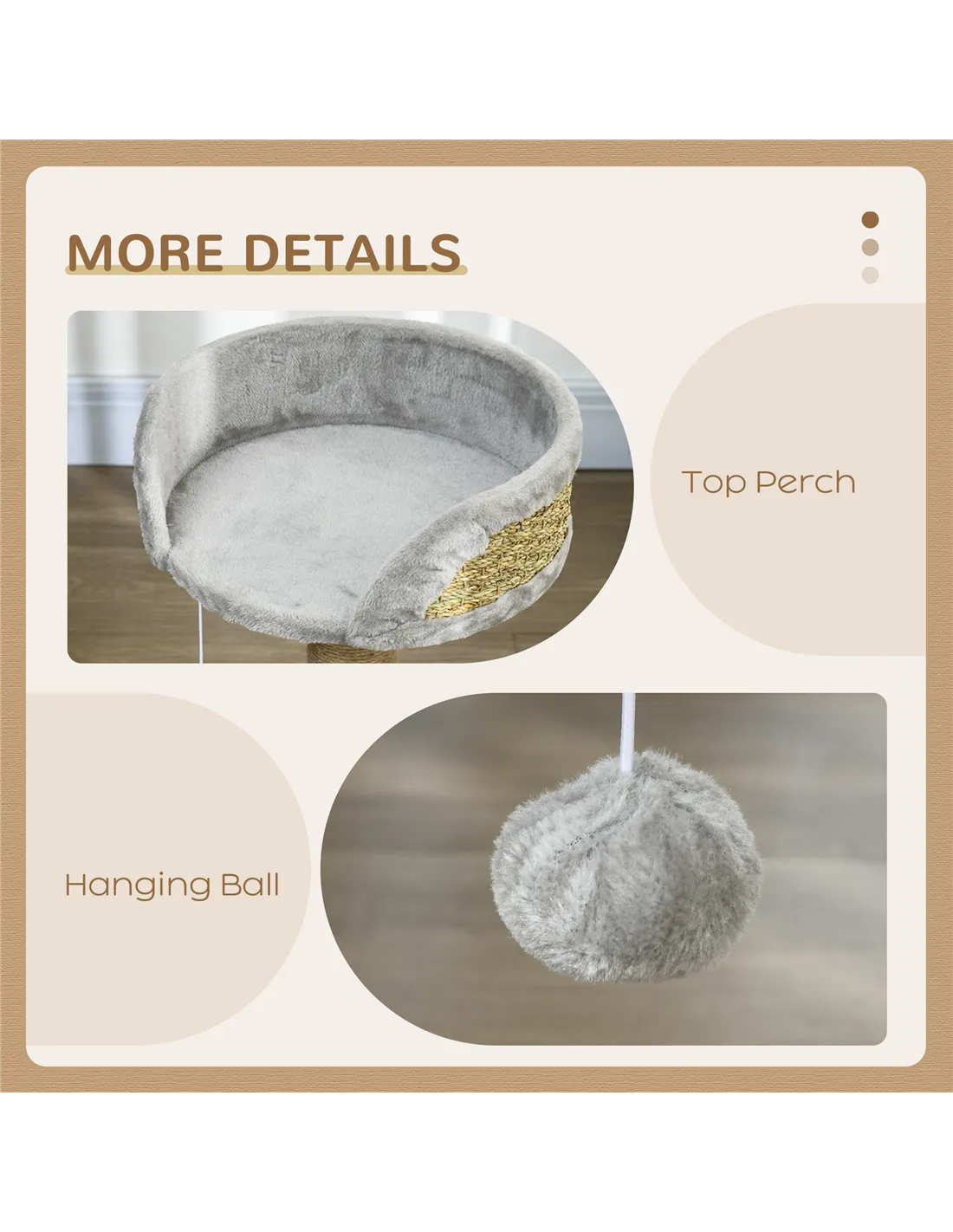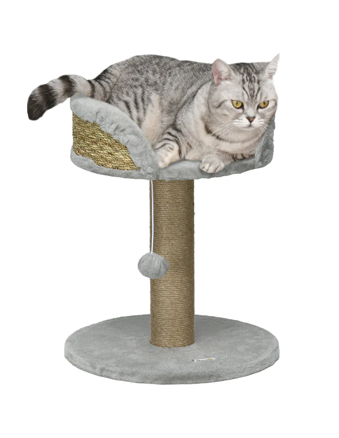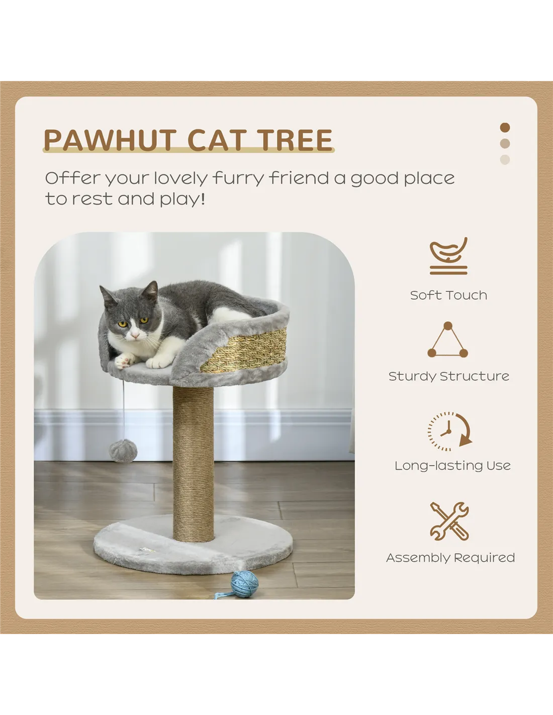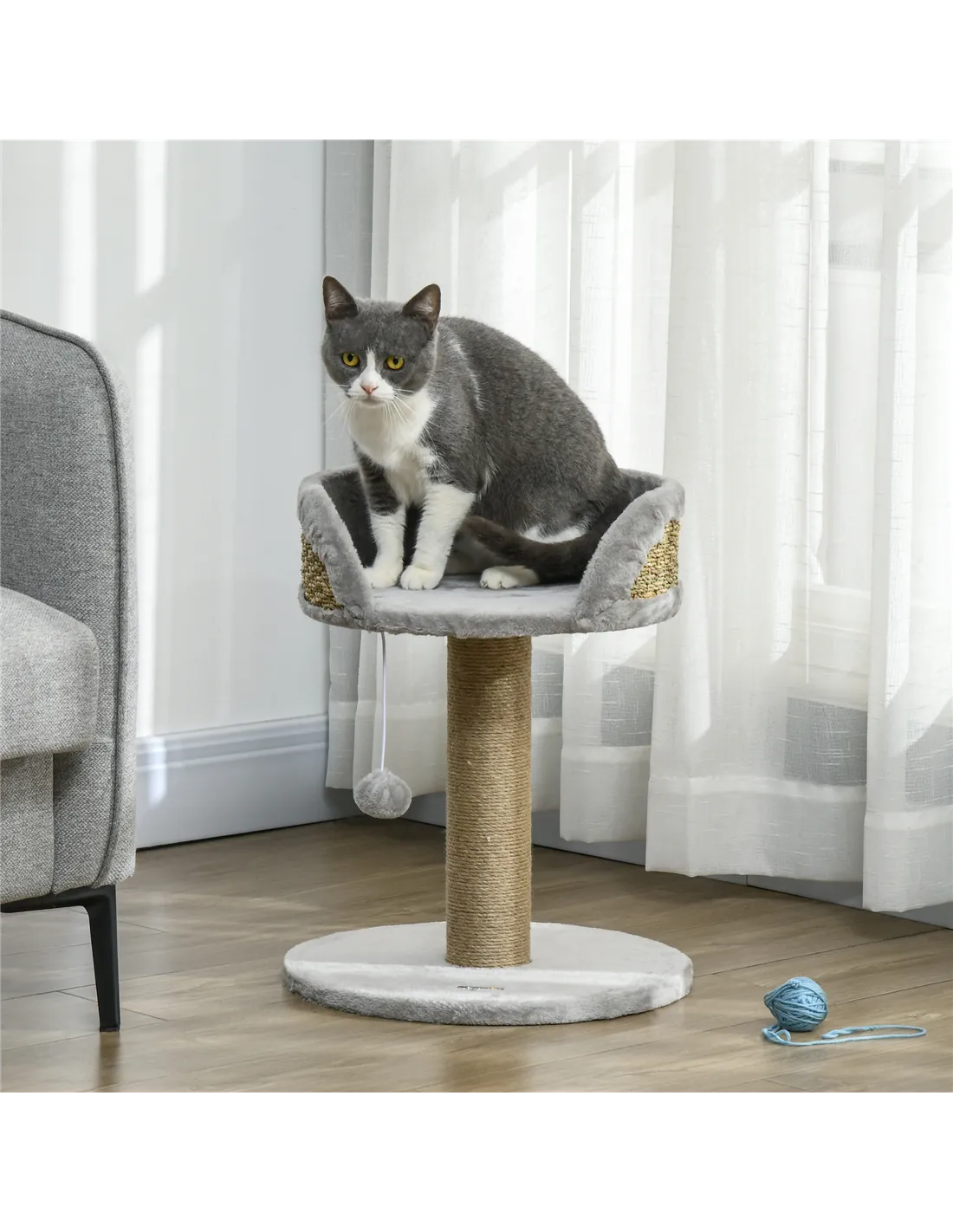 The scratching post is wrapped in natural jute rope, providing a robust surface that withstands regular use and helps maintain your cat’s claws.