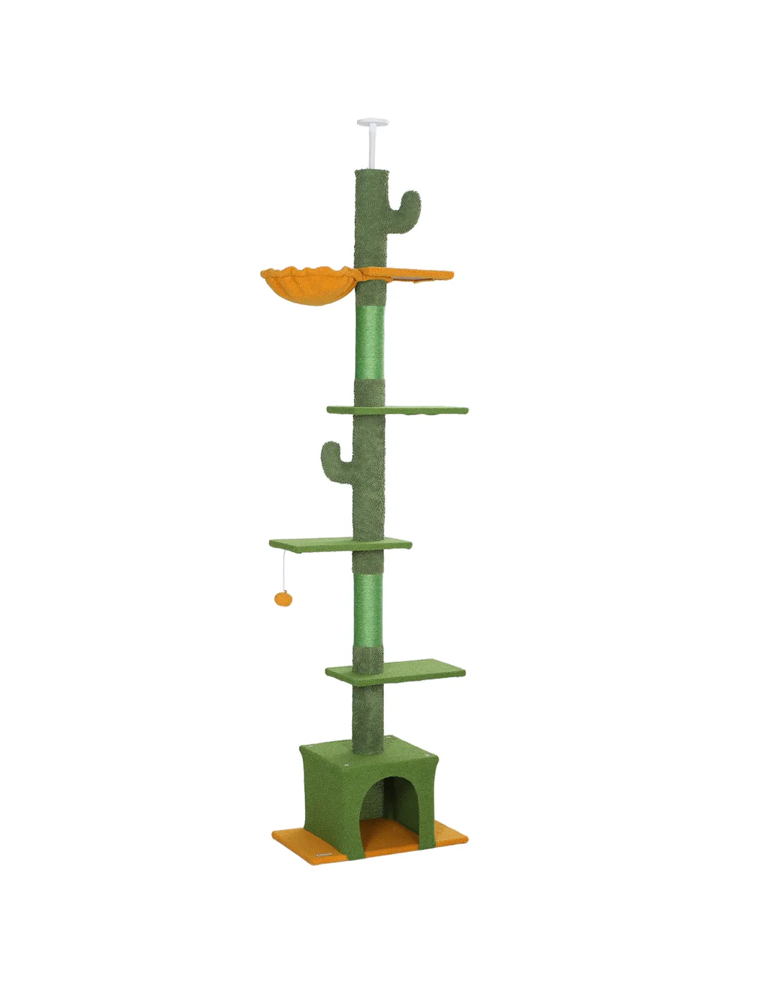Take pet fun to new heights with the PawHut floor-to-ceiling cat tree. Adjustable from 230-275cm, it fits any room seamlessly. Multi-level platforms and a cat scratching post keep cats entertained and away from furniture. They can curl up on the hammock or lounge in the cat house when tired. Covered in velvet and chenille for comfort, cat scratching tree has a wide base and anti-tipping kit for stability. Fun for pets, space-saving and practical for any cat owner.
