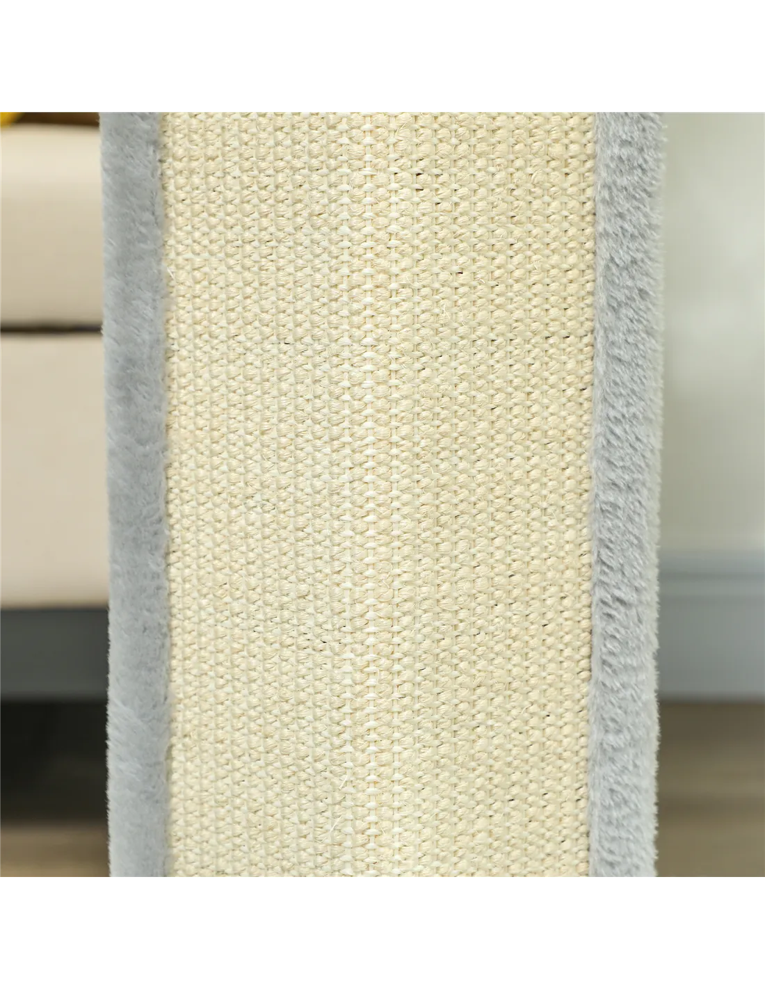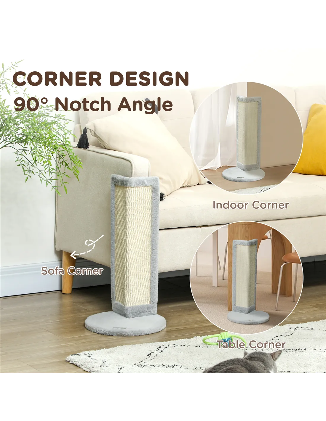 Cat owner with minimal space? This compact PawHut cat scratch post is your go-to! With its 90° notch angle, it fits easily into any corner. Tall and upright, it's covered with tough sisal for continuous clawing and scratching, while the plush-covered base is amazing for curling up and relaxing. The large, stable base keeps it balanced, even during the most enthusiastic scratch sessions – a must-have for indoor cats.