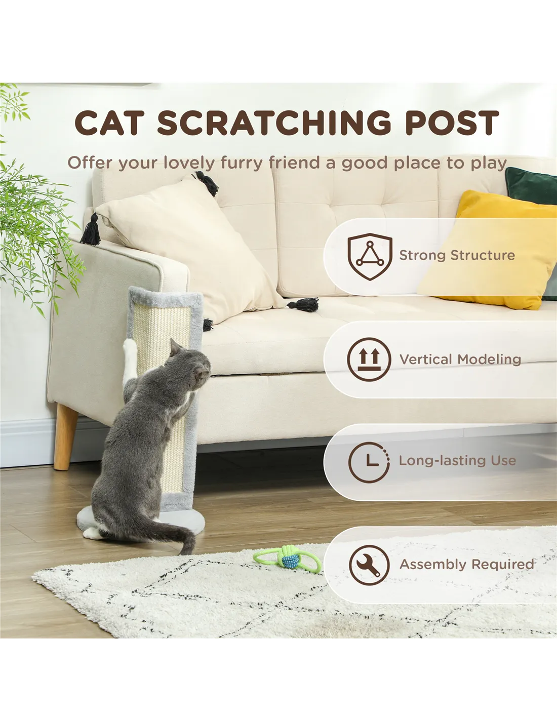 The post combines durable particleboard, tough sisal for scratching, and a plush-covered base for added comfort, ensuring longevity and appeal for your pet.