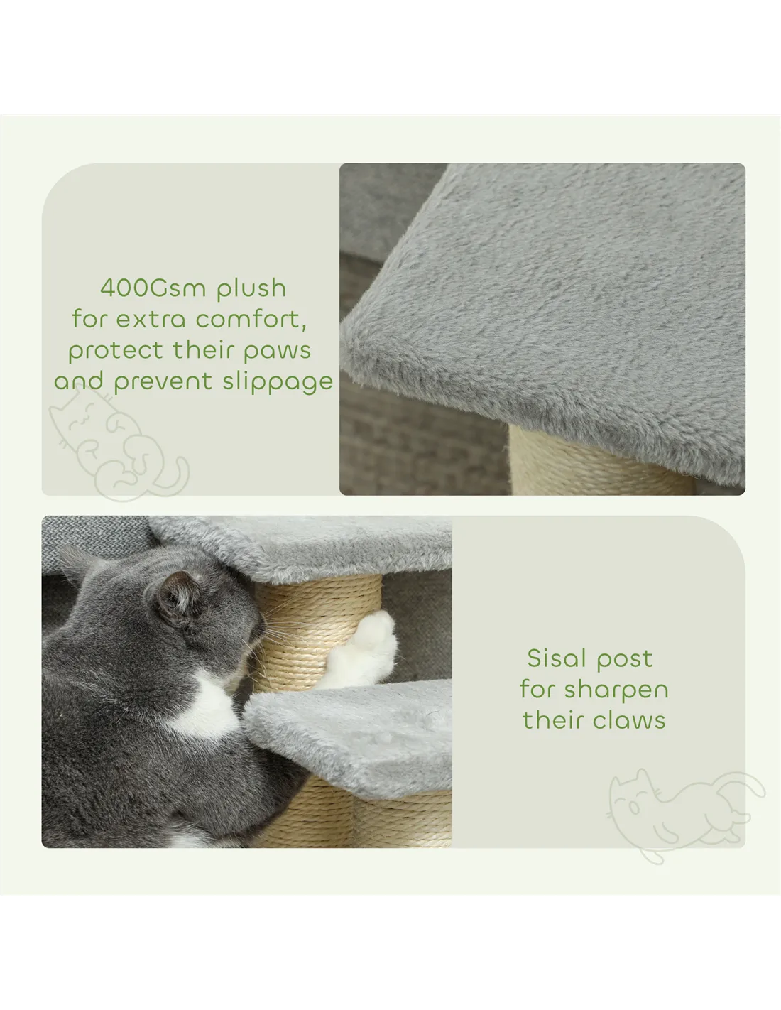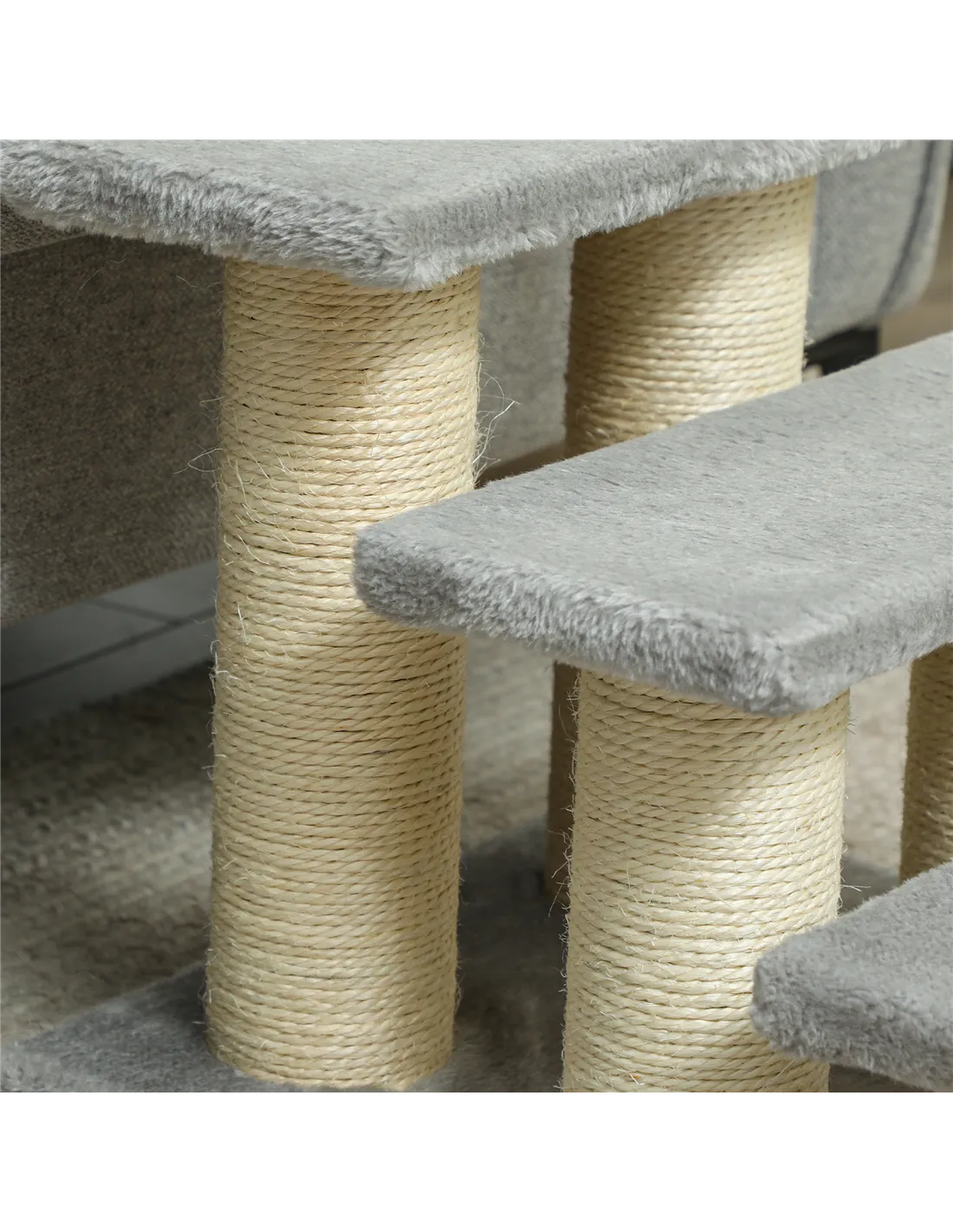 - Scratching posts integrated into the design encourage natural claw maintenance, protecting your home furnishings.
