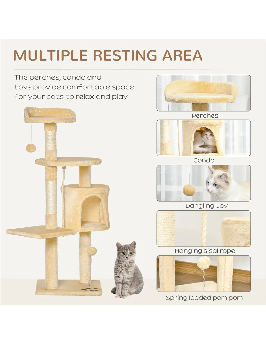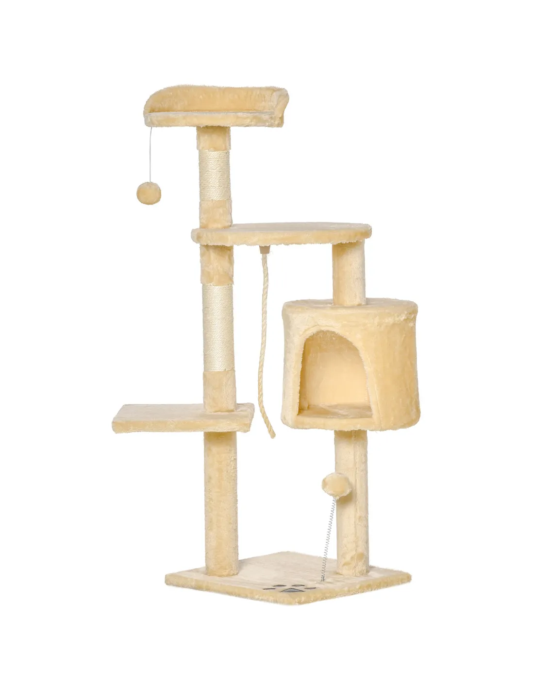 PawHut Cat Tree for Indoor Cats Pet Activity Centre Kitty Condo Climbing Scratching Post with Toys 4-tier 114cm Tall Beige