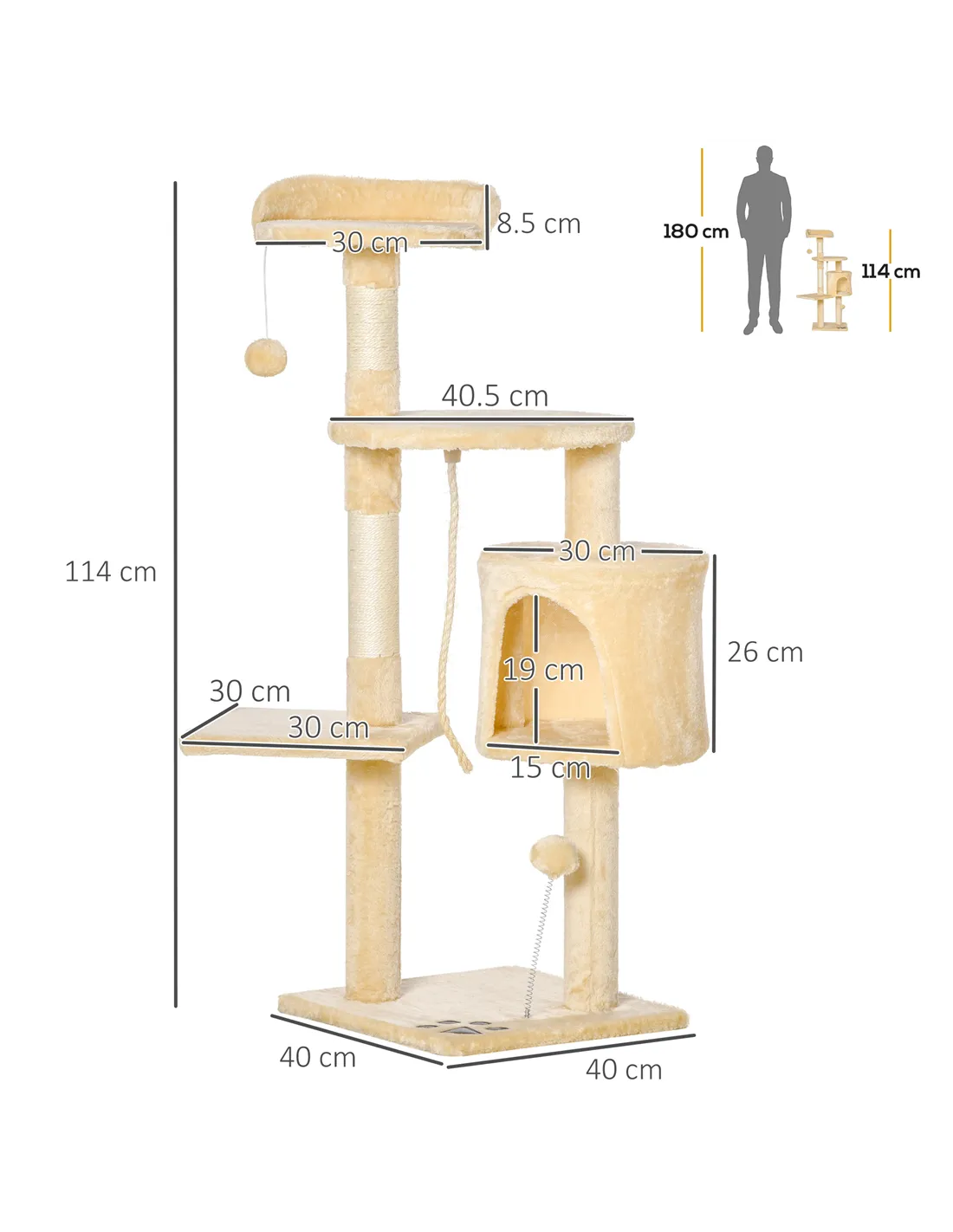 Stimulate your cat's natural instincts in a fun and safe way with a 114 cm cat tower from PawHut. It's a multi-use activity center with scratching post, cat house, multiple perches, dangling toy, and spring-loaded pom for extra enjoyment. Cat scratching posts benefit both pets and owners by providing an acceptable release for an animal's natural instincts while saving carpets and household furniture from damage. They provide a comfortable haven for security and rest.