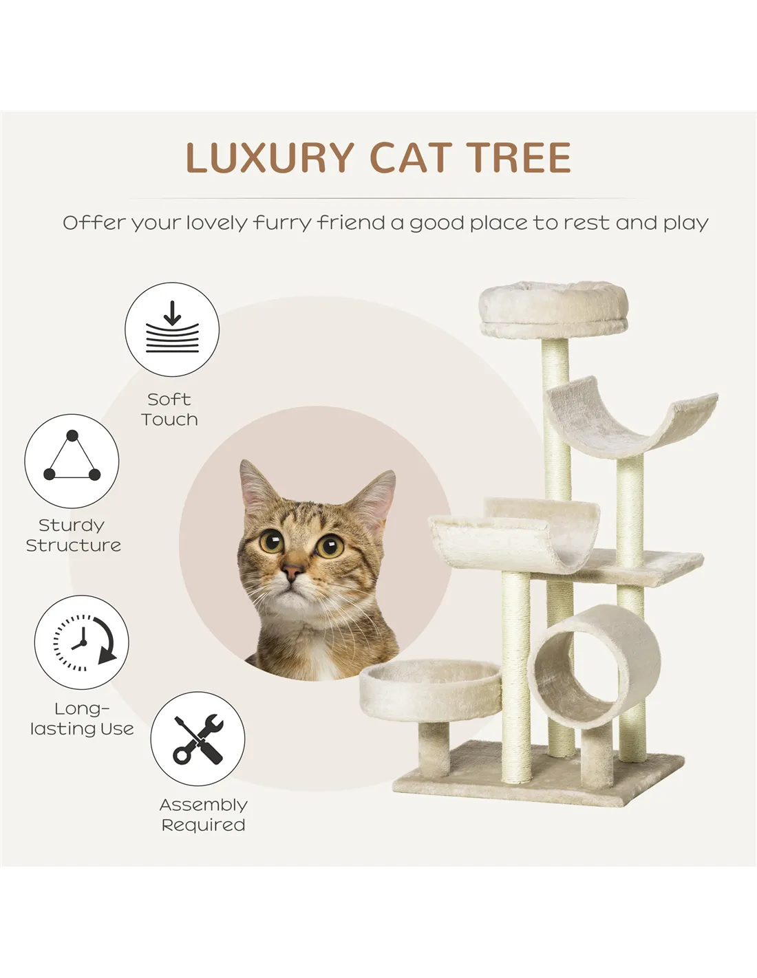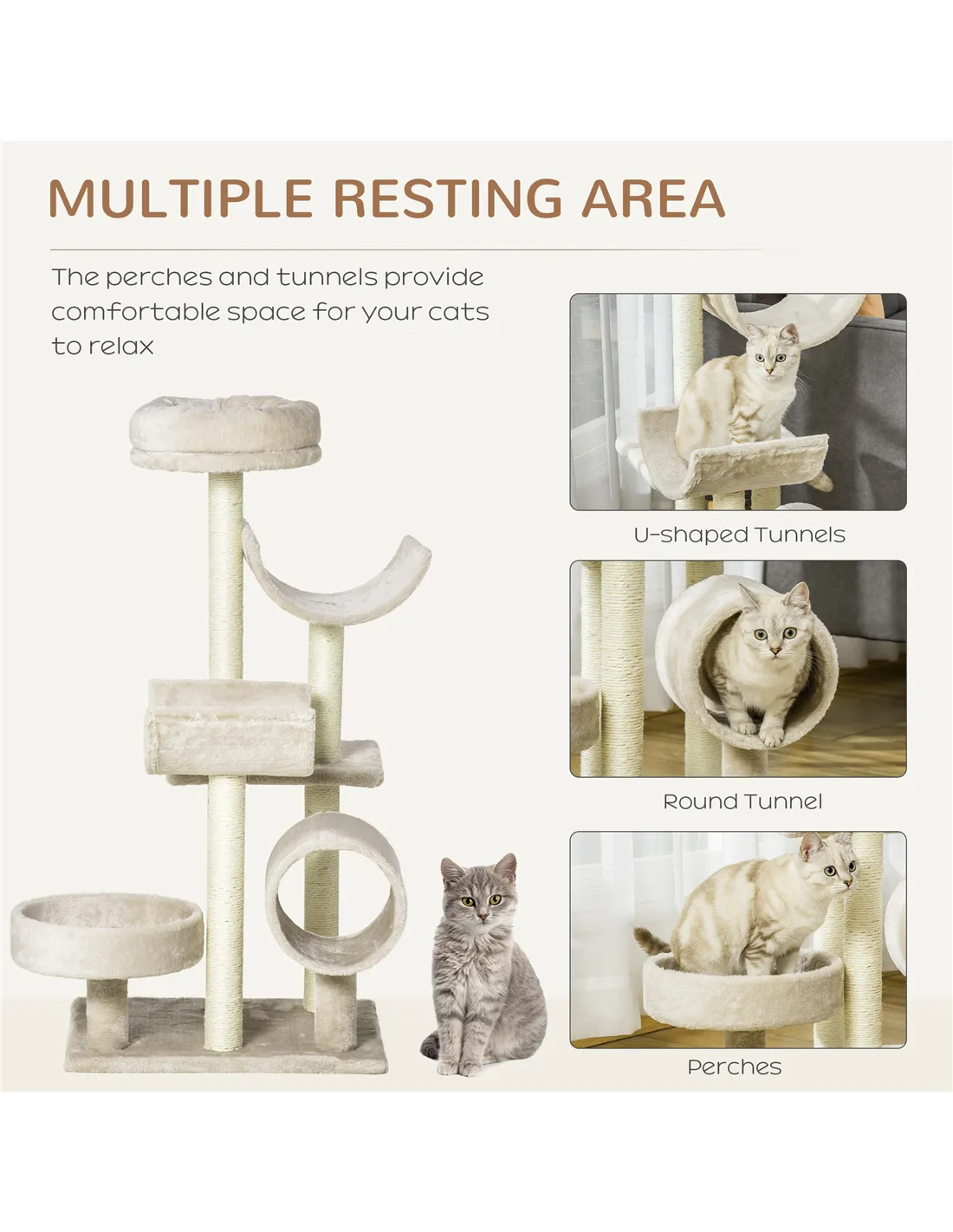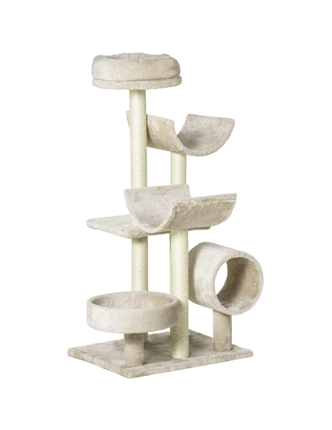 PawHut Cat Tree for Indoor Cats Kitten Pet Scratching Post Perch Activity Center Scratcher Climb Post Play House Arch with Tunnel 105cm Tall Beige