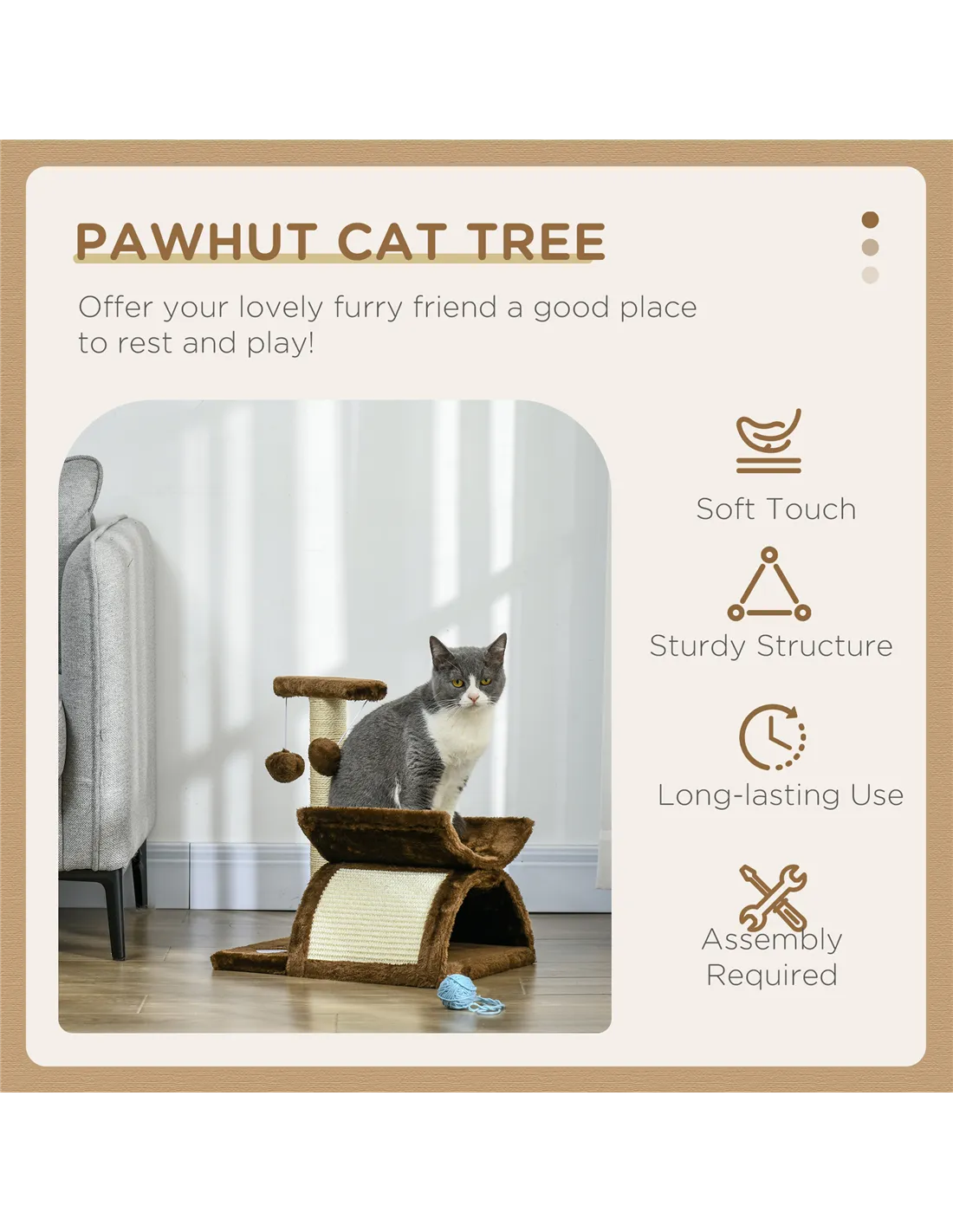- Use the sisal scratching post and bridge to redirect clawing behaviour away from furniture, protecting your home’s interiors.