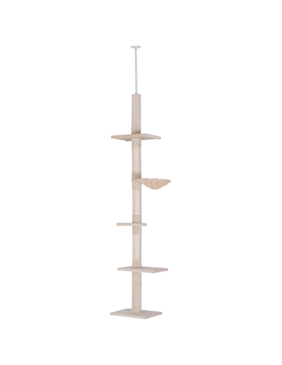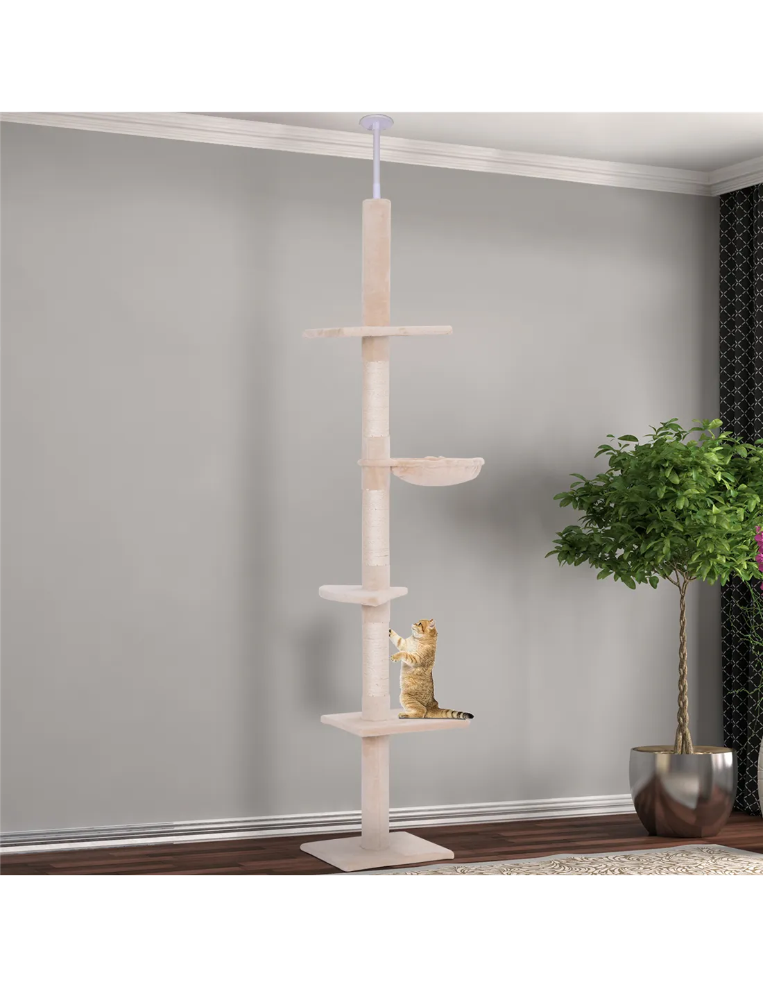 PawHut Floor to Ceiling Cat Tree Height Adjustable 230-260cm, 5-Tier Cat Tower with Scratching Post, Hammock, Perches, Climbing Activity Centre for Indoor Kittens, Beige