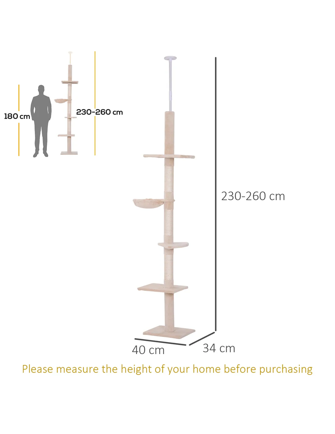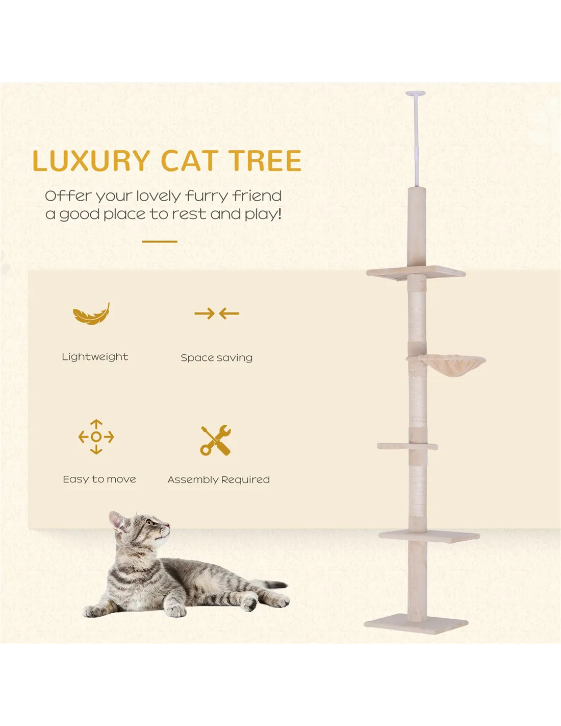 Yes, the tower’s height is adjustable from 230cm to 260cm, allowing a secure fit for ceilings within this range. - Does the cat tree require assembly?