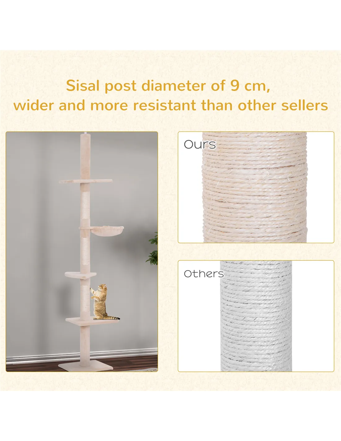 Designed to fit seamlessly in your home, this adjustable cat tower from PawHut offers a versatile climbing and resting space for indoor kittens and small cats up to 5kg. Its height can be tailored between 230cm and 260cm to suit rooms with varying ceiling heights, making it ideal for living rooms, bedrooms, or cosy corners. The five-tier design provides multiple perches and platforms where your feline friend can lounge, observe, or play. The integrated scratching post helps protect your furniture, while the soft plush covering ensures comfort during naps. The hammock adds an extra cosy retreat, perfect for cats who love to curl up off the ground. Thanks to its neutral beige tone, this cat tree blends effortlessly with most interior styles, enhancing your home without overwhelming the space.
