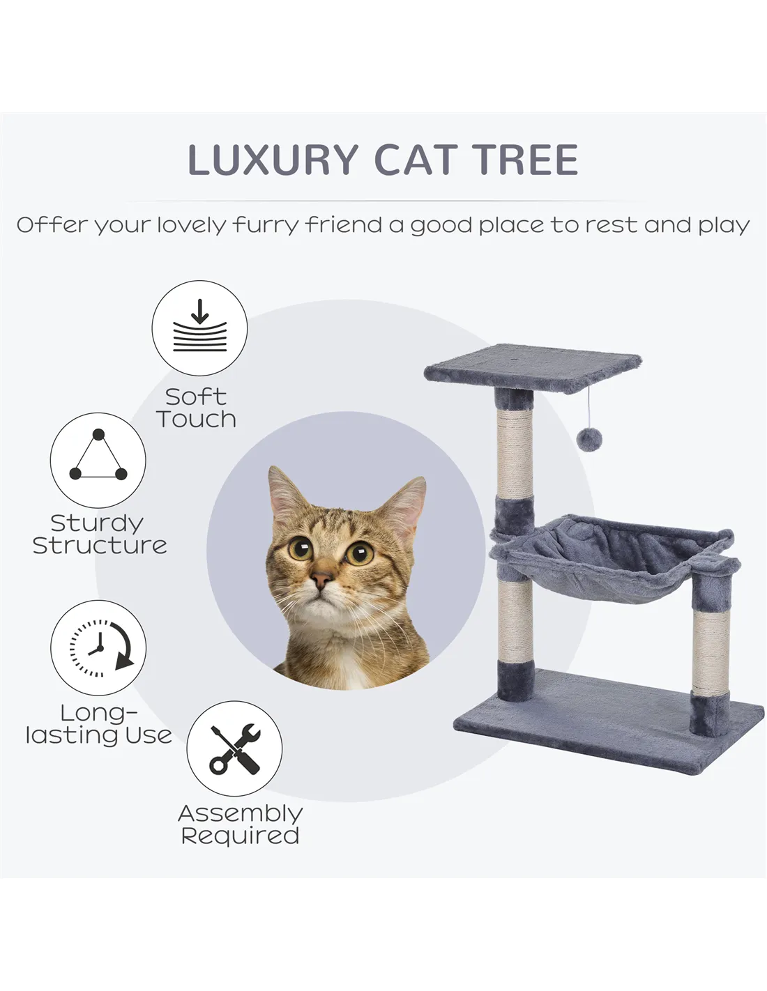 Based on reviews from UK customers, the PawHut cat tree is praised for its sturdy construction and attractive grey finish that complements modern interiors. Many owners appreciate the soft plush covering, which ensures comfort and safety during play and rest. The sisal scratching posts are highlighted as effective in redirecting scratching behaviour away from furniture. Users also note the ease of assembly and the inclusion of a hanging toy that keeps cats entertained. Overall, the product receives positive remarks for durability and value, making it a popular choice among indoor cat owners.