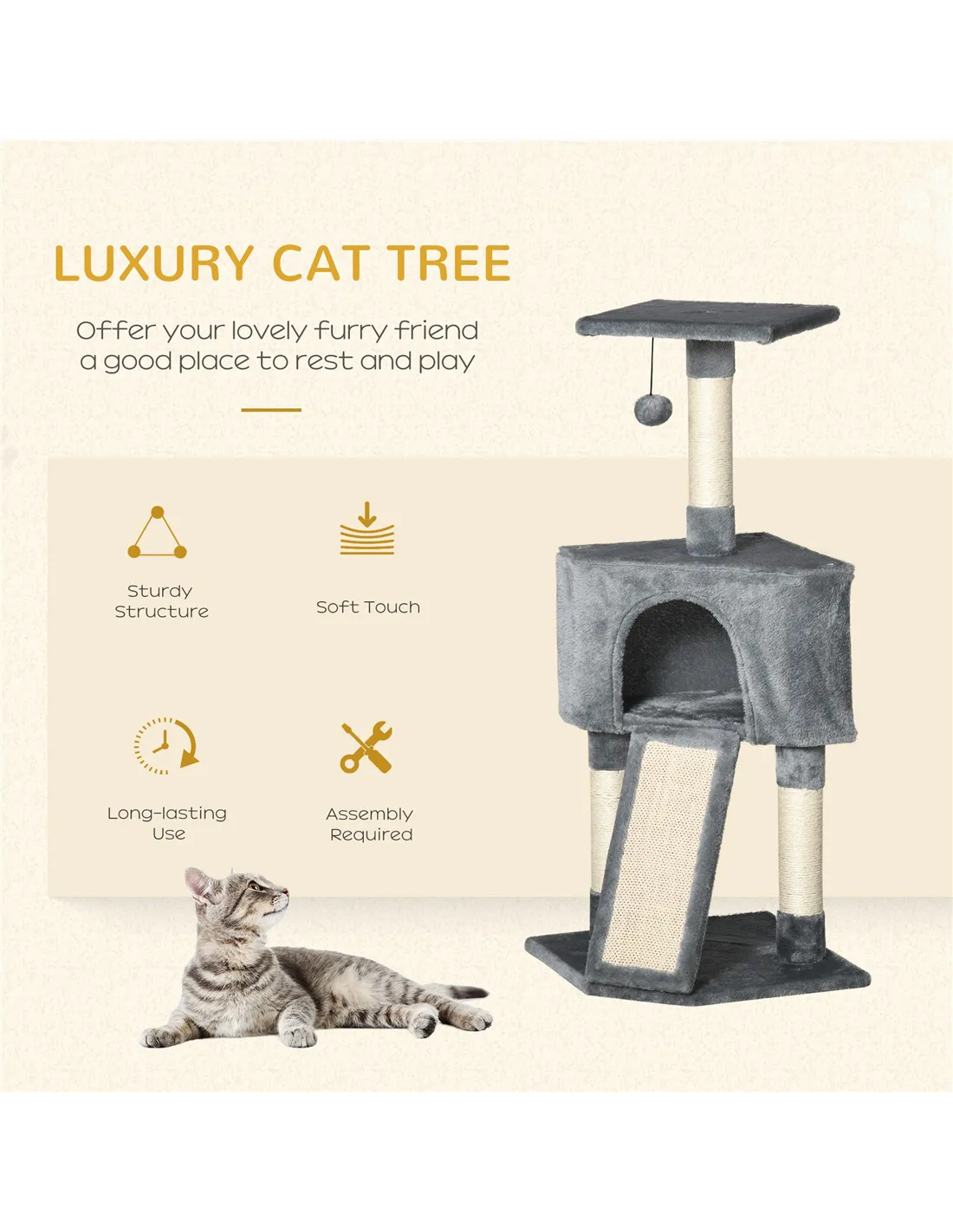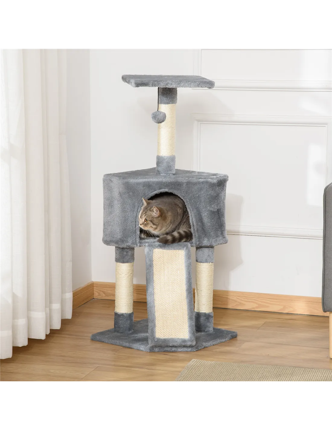 Treat your pet to this comfortable PawHut cat tree tower, designed to fit in the corner of your room. Featuring a cat house, perch and ramp, cats will have lots of space to play and relax. They'll dig their claws into the scratching posts and board, whilst the toy ball keeps them entertained when feeling playful. Covered with soft plush, it's comfortable on their paws, keeping them cosy. Finished with a stylish appearance that fits any decoration, you won't mind seeing it around the house.