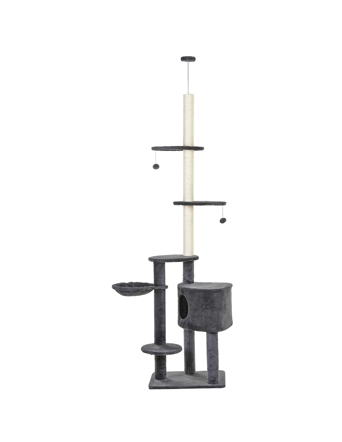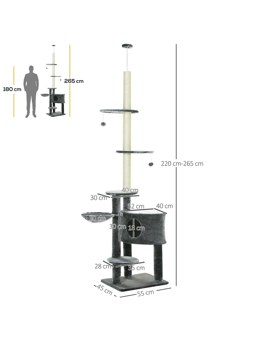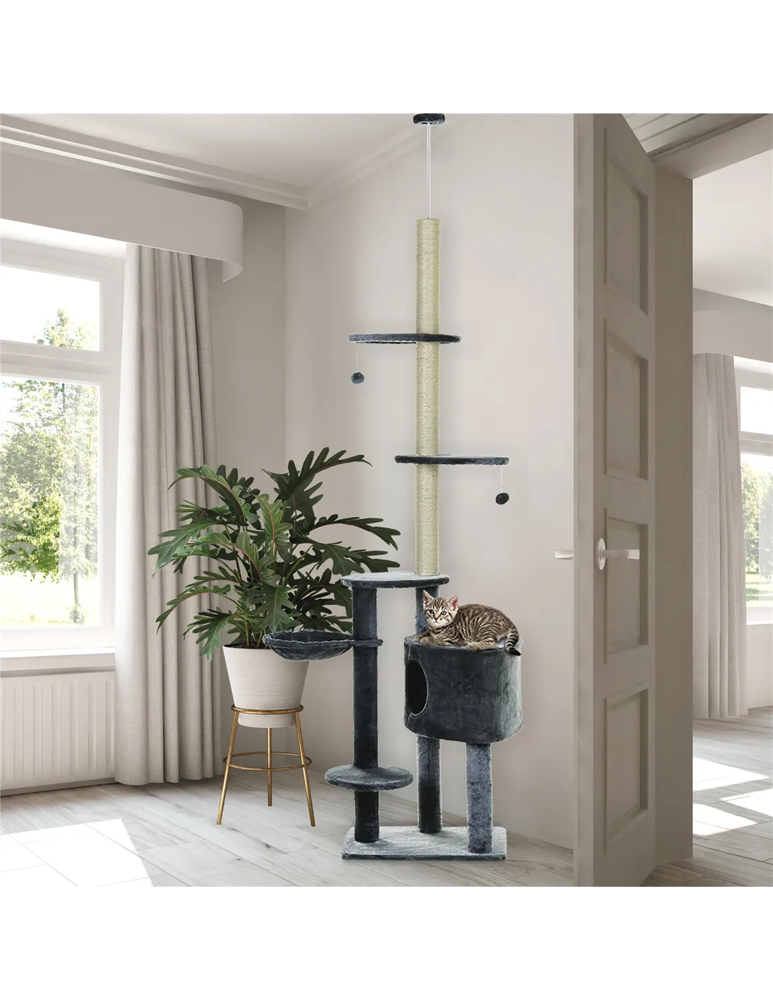PawHut Floor to Ceiling Cat Tree for Indoor Cats Play Tower Climbing Activity Center Scratching Post Platforms Condo Adjustable Height 220-265cm Dark Grey