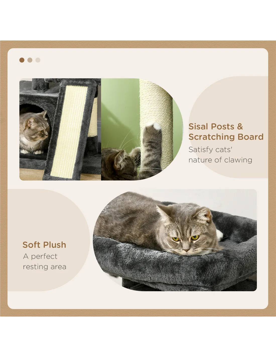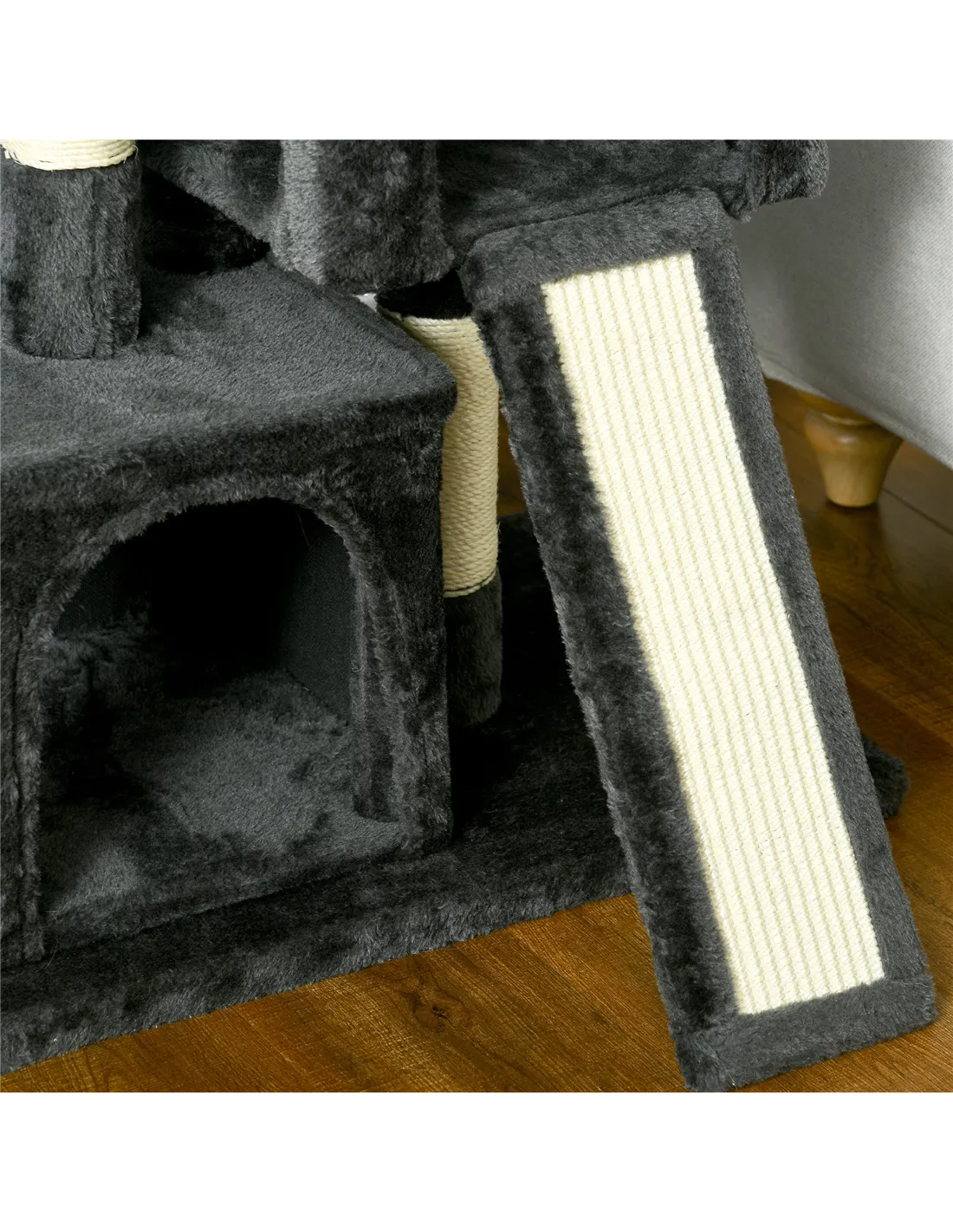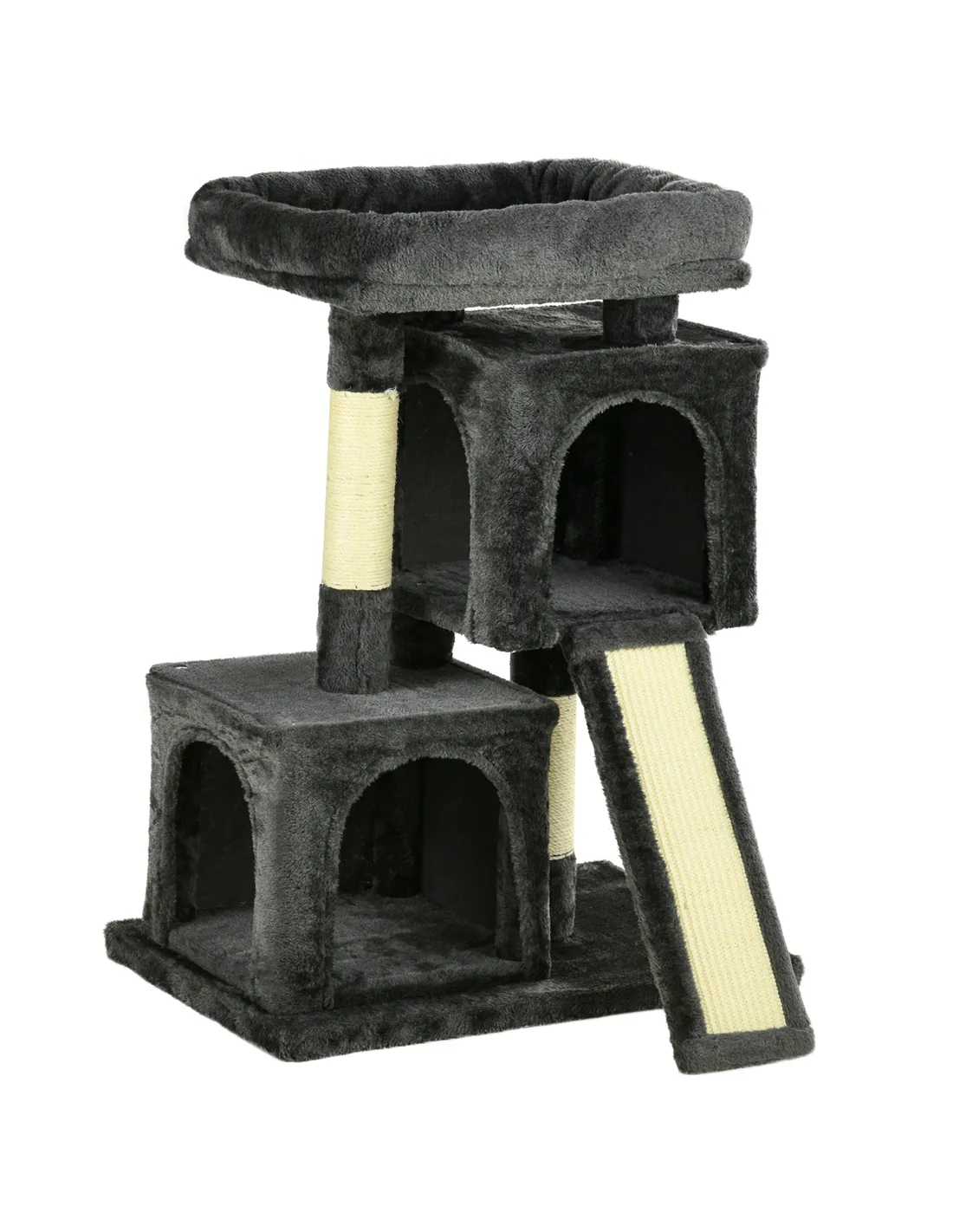 - Features two large houses, several sisal scratching posts and a large top cushioned perch