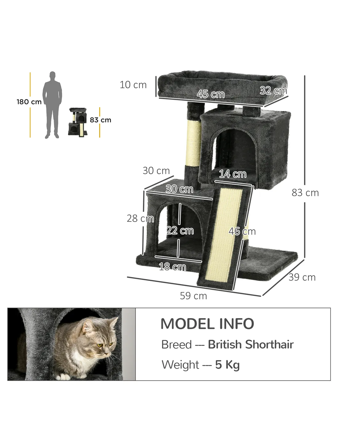 - Dimensions: 83H x 59L x 39Wcm. House: 28H x 30L x 30Wcm. House door: 228H x 18Lcm. Perch from bottom to top: 50L x 29Wcm, 10H x 45L x 32Wcm. Pole: Ф7cm. Bottom scratching board: 14L x 46W cm