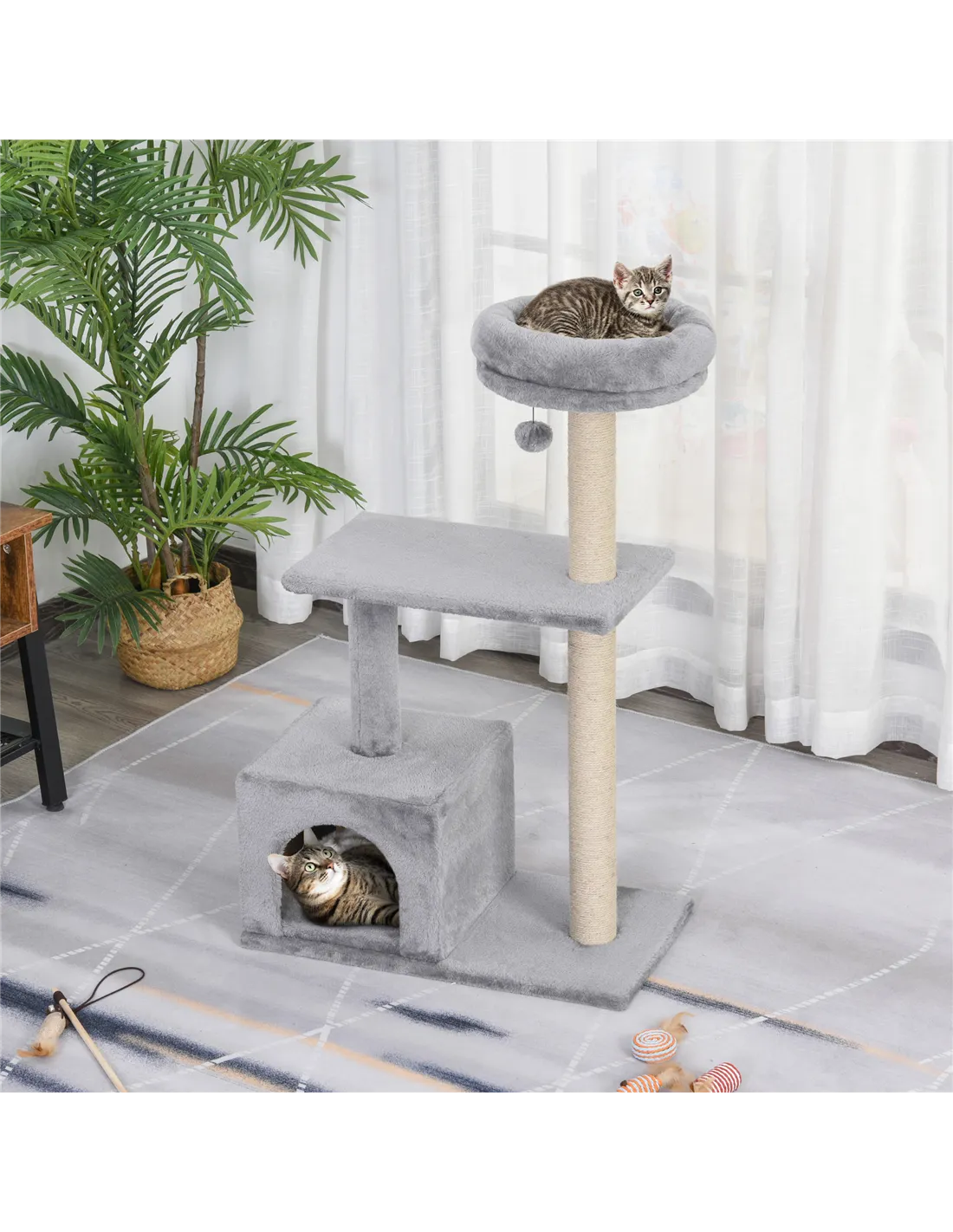 The PawHut 96cm cat tree is an ideal addition to any British home with indoor cats, providing a dedicated space for rest, play, and exercise. Position it in your living room or bedroom to complement modern interiors with its neutral grey finish. The soft basket offers a cosy retreat for your feline to nap or observe their surroundings, while the dangling ball and sisal scratching post encourage active play and healthy claw maintenance. Multiple platforms allow several cats to explore, climb, and relax simultaneously, making it perfect for multi-cat households. This compact yet versatile cat tower fits comfortably in flats or houses, helping to protect your furniture and carpets from scratching damage.