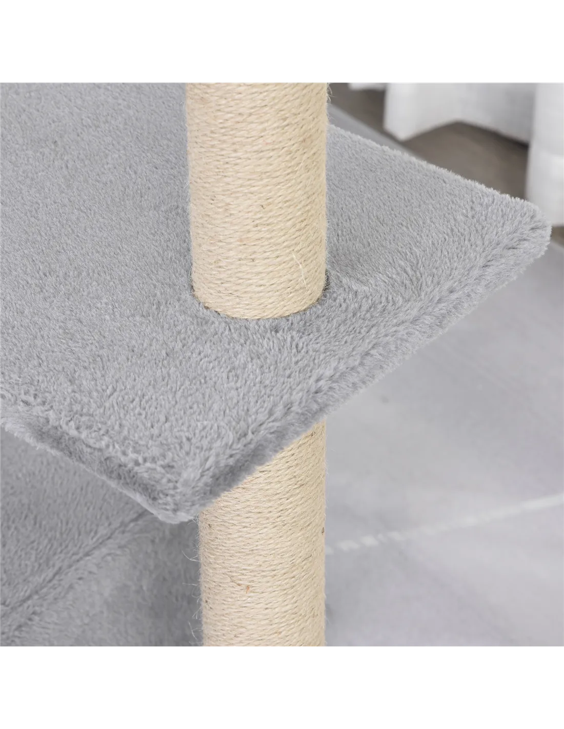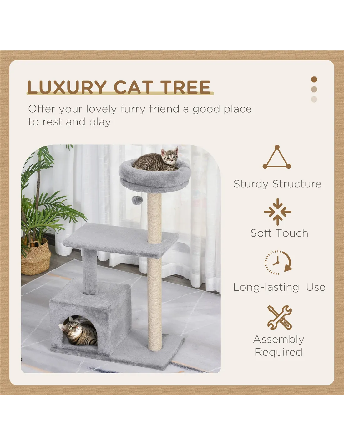 The structure is made from E1 grade particle board, jute for the scratching post, and soft plush fabric for the basket and platforms, ensuring safety and comfort. - Does the cat tree require assembly?