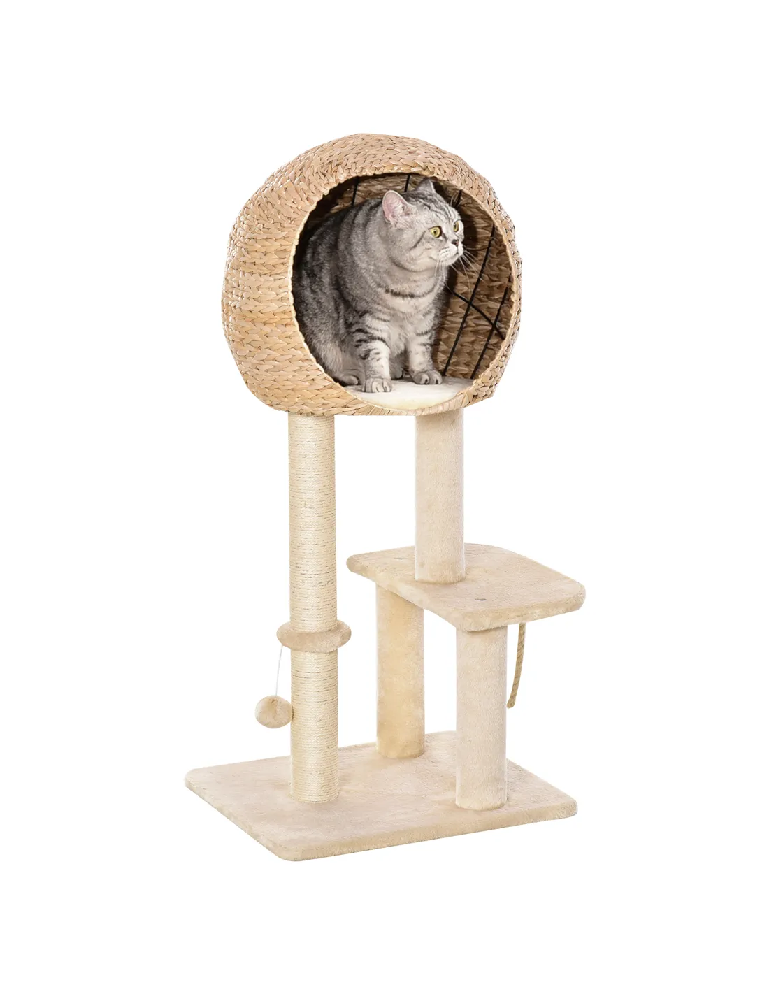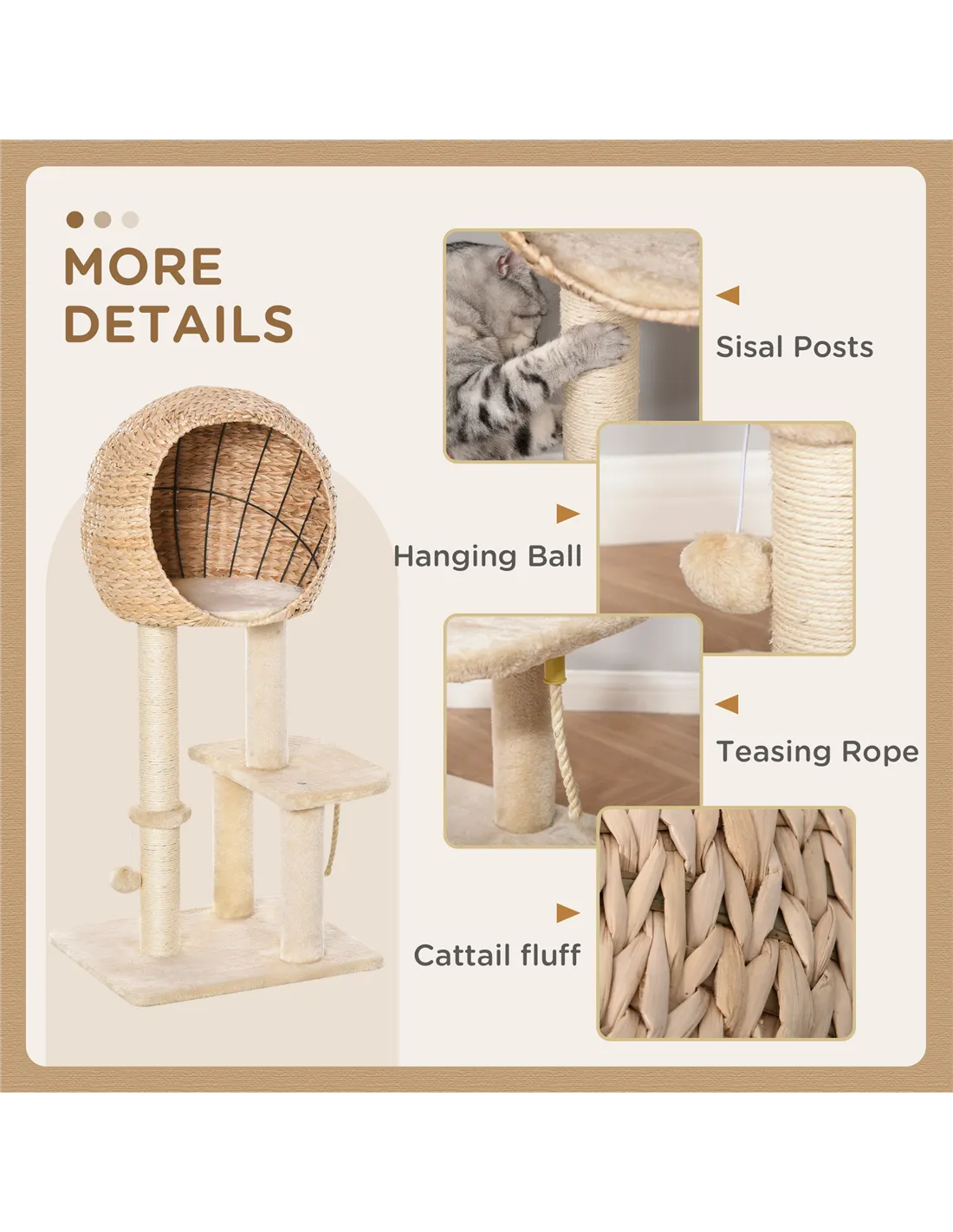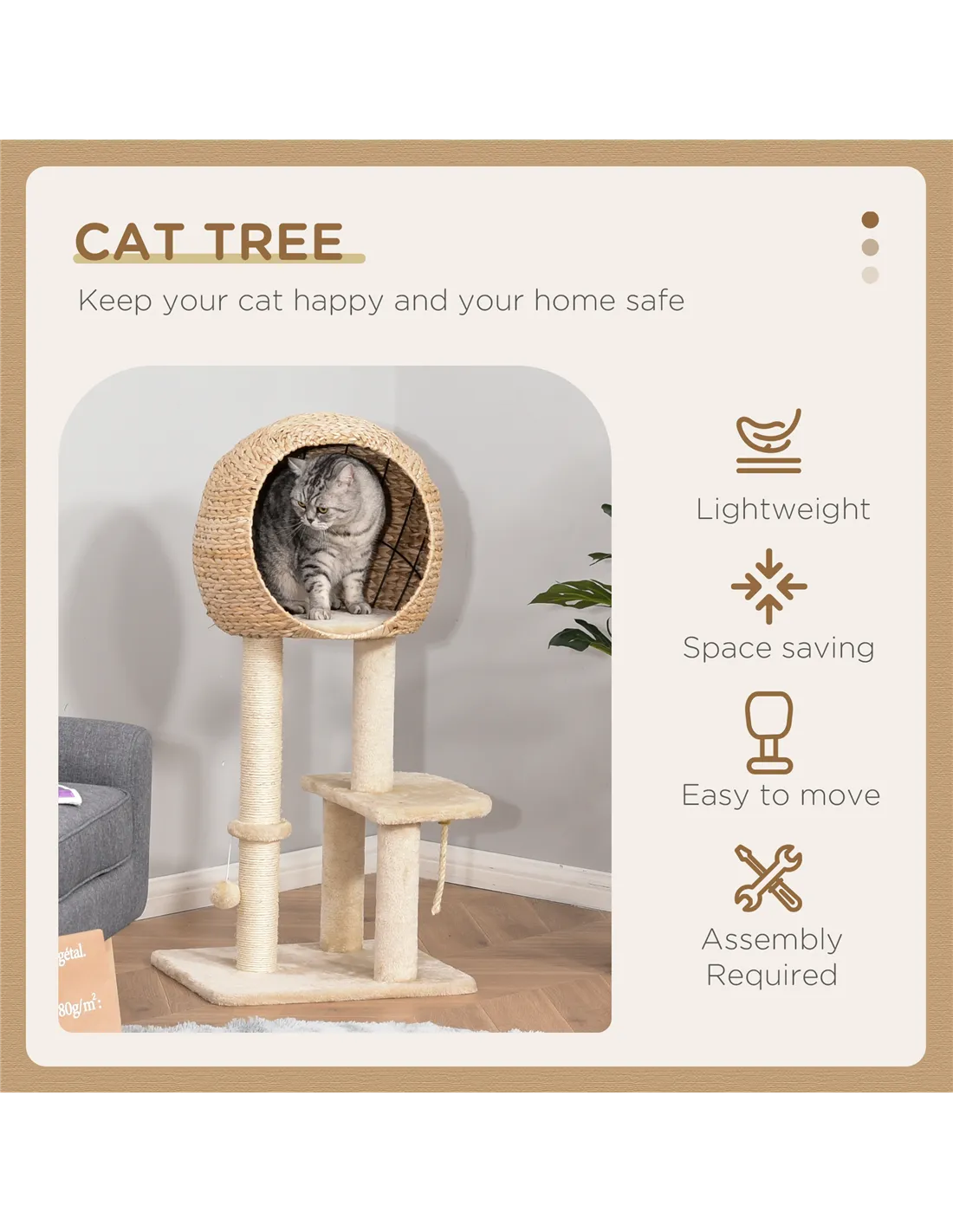 PawHut Cat Tree for Indoor Cats 100cm Kitten Climbing Tower Activity Center with Sisal Scratching Post Condo Perch Hanging Balls Teasing Rope Toy Cushion